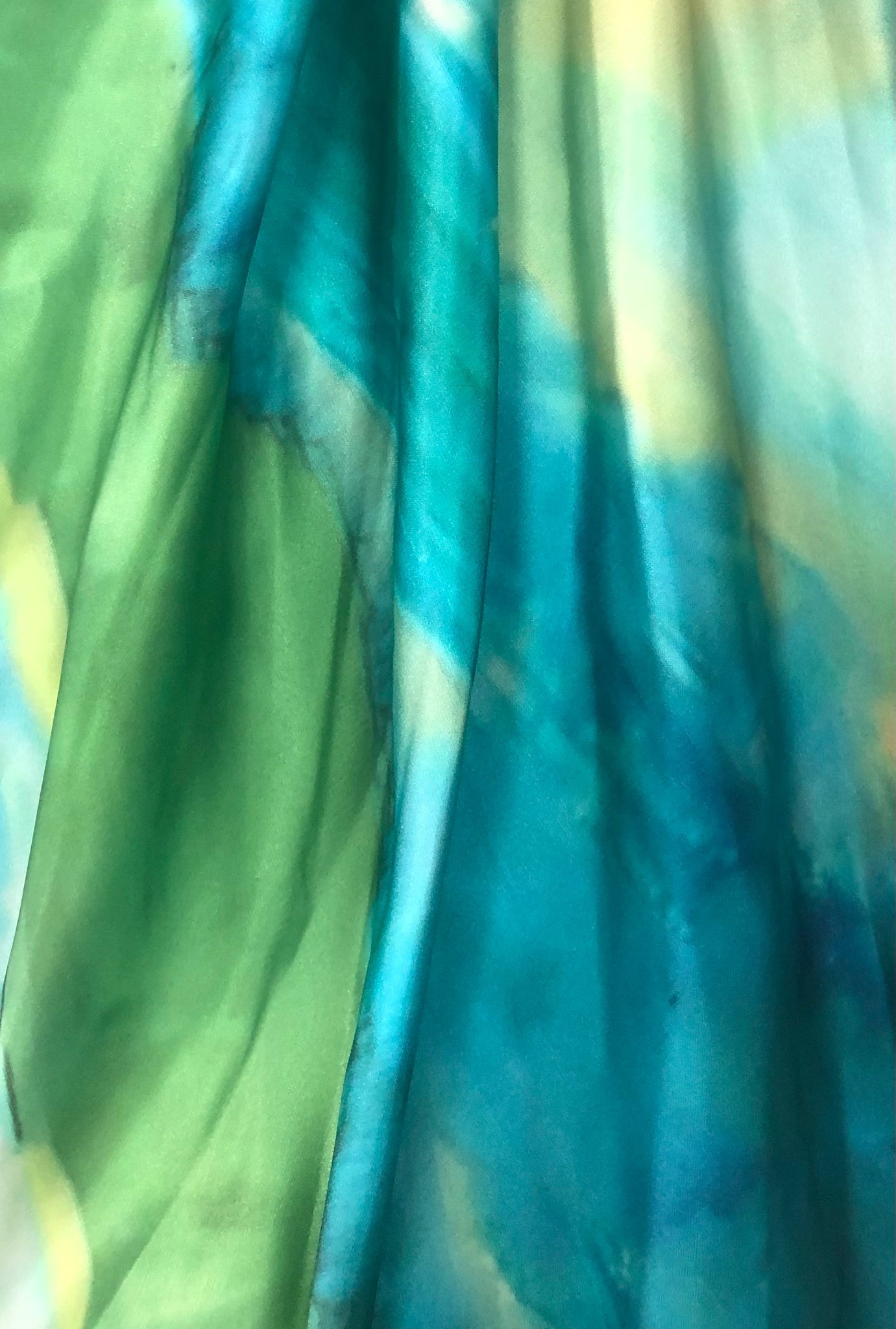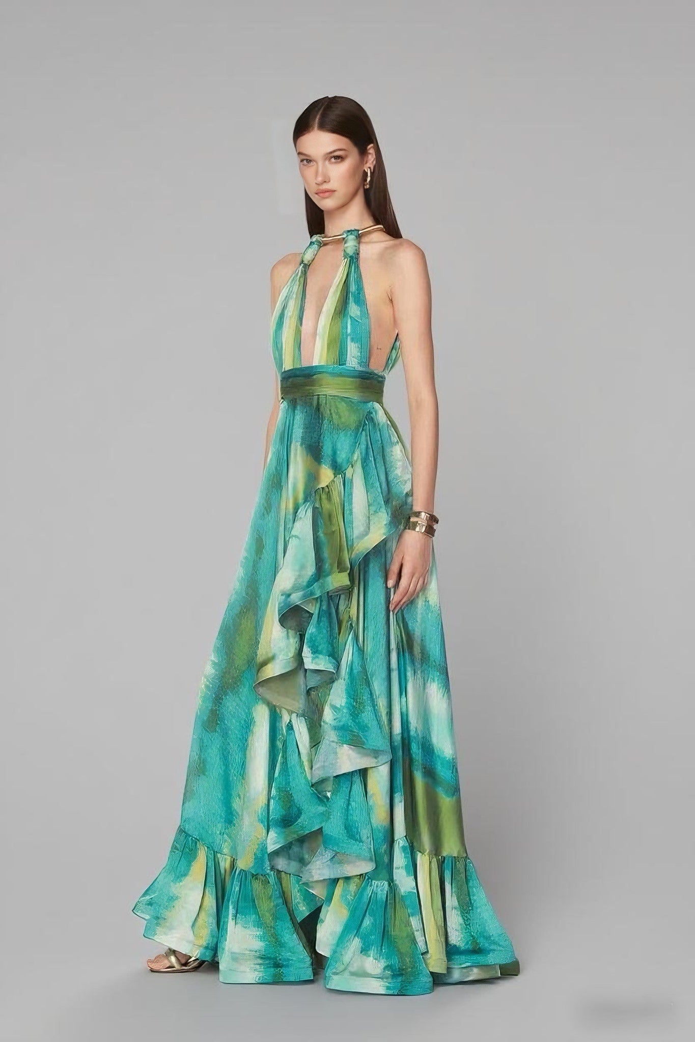 This elegant gown features a flowing high-low silhouette with cascading ruffles that create soft, graceful movement. The fabric showcases a watercolor-style blend of aqua, teal, and hints of lime, giving it a dreamy, ethereal look. The halter neckline includes a stylish keyhole detail, while the fitted waistband accentuates the figure before transitioning into a layered, asymmetric skirt. Light, airy, and sophisticated, this dress is perfect for upscale summer events, seaside weddings, or evening soirées where a statement of effortless glamour is desired.