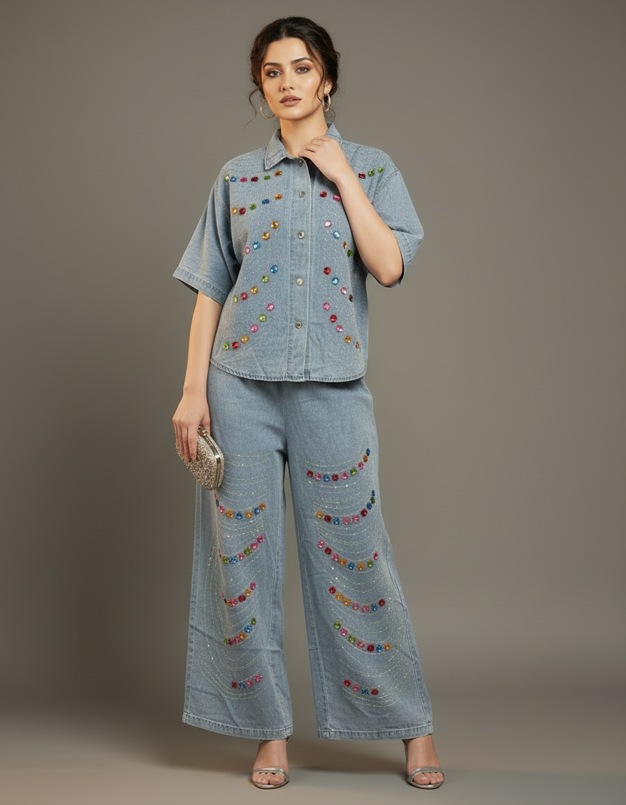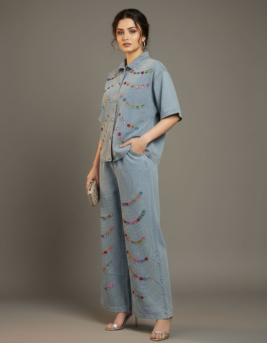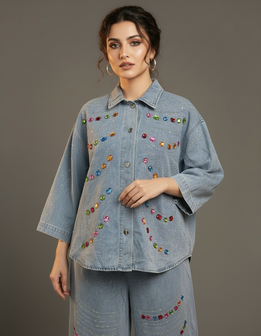 Make a statement with this chic and trendy two-piece denim set. This ensemble features a stylish button-down jacket with a classic collar and three-quarter length sleeves, paired with matching wide-leg pants. The light-wash denim is soft and comfortable, perfect for all-day wear. The standout feature of this set is the vibrant, multi-colored rhinestone embellishments that are artfully scattered across the jacket and pants, adding a touch of sparkle and glamour to your look.