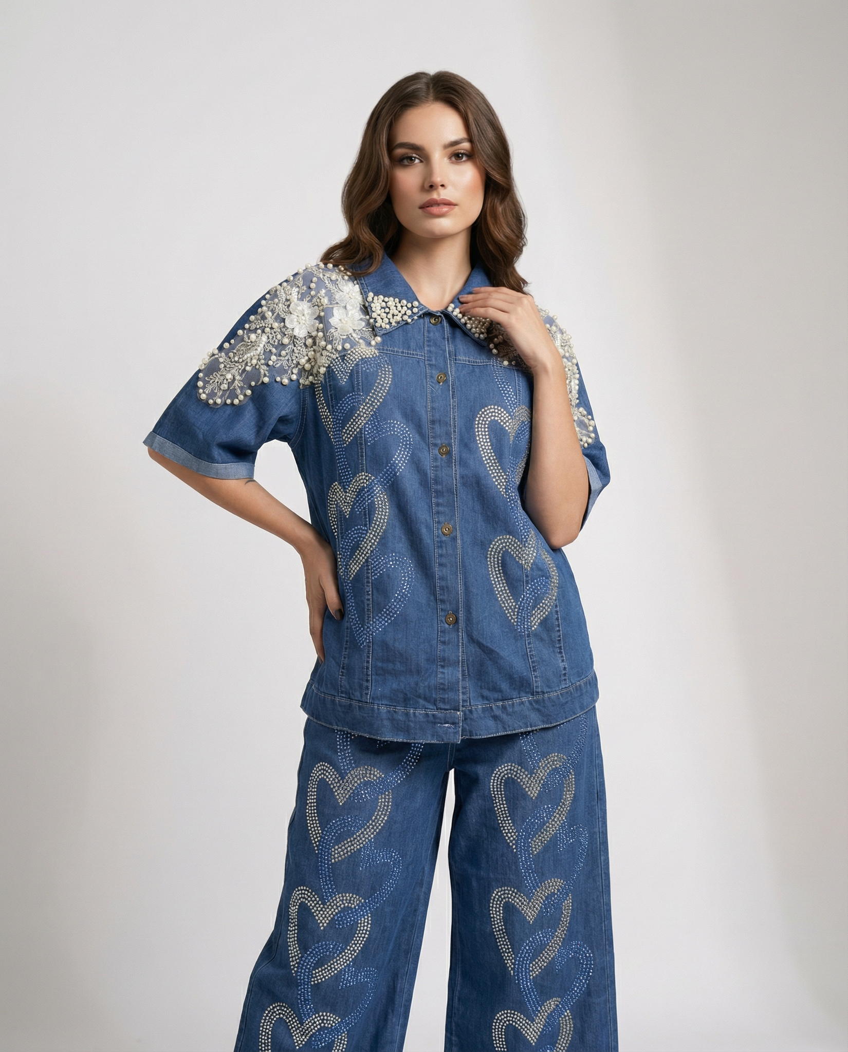 Fall in love with this charming two-piece denim set, featuring a playful heart motif. The ensemble includes a short-sleeved, button-up shirt with a classic collar and matching wide-leg pants. The dark-wash denim provides a classic backdrop for the shimmering silver beadwork that forms interlocking hearts.