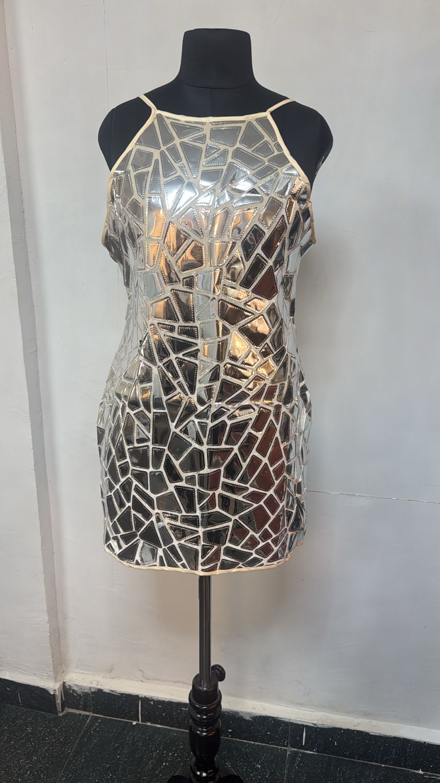 A bold and futuristic bodycon dress designed with mirror-like holographic shards stitched onto a nude mesh base. This statement piece reflects light dramatically, ensuring you sparkle from every angle.