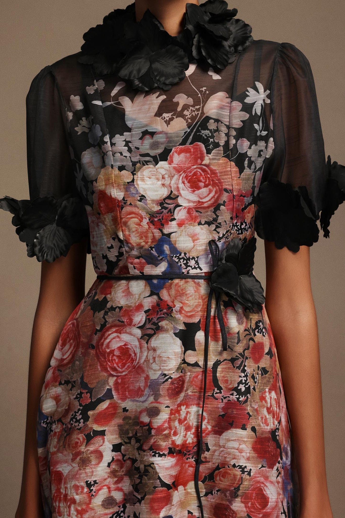 A dramatic black dress blooming with rich floral prints, featuring delicate details and a graceful silhouette that fuses vintage charm with modern sophistication.