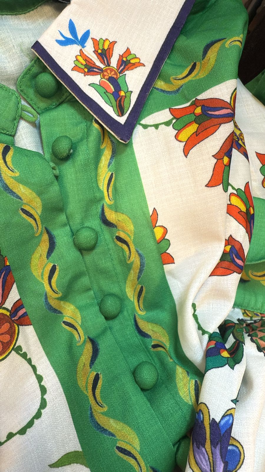 • Details: Contrasting green trims on placket, cuffs, and hemline