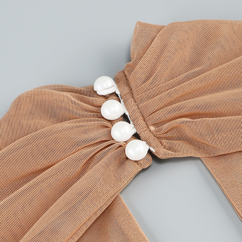 A sultry, figure-embracing creation in a warm bronze shade that glimmers with understated glamour. The halter neckline plunges into a daring deep V, while ruched mesh sculpts the curves like a love letter to the hourglass silhouette. The hem transitions into sheer mesh, adding a teasing touch of transparency that feels both bold and artfully refined. It’s the kind of dress that walks into the room already knowing it’s the main attraction.