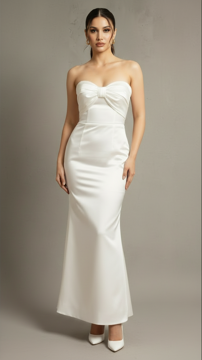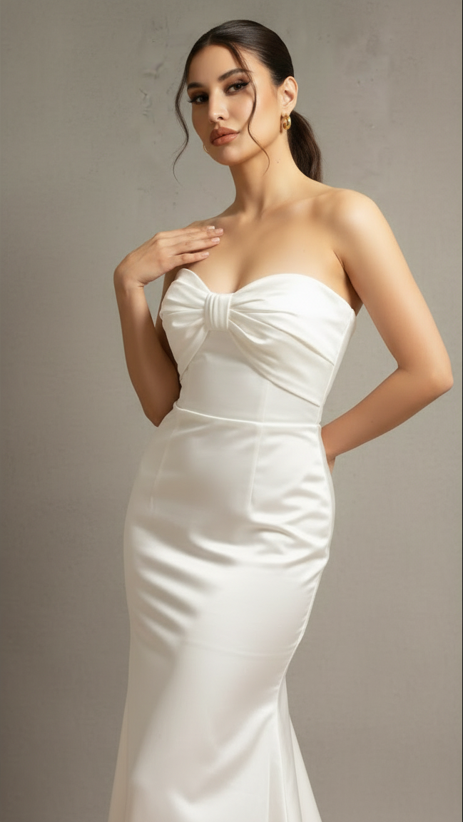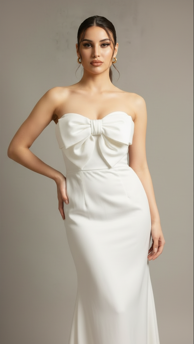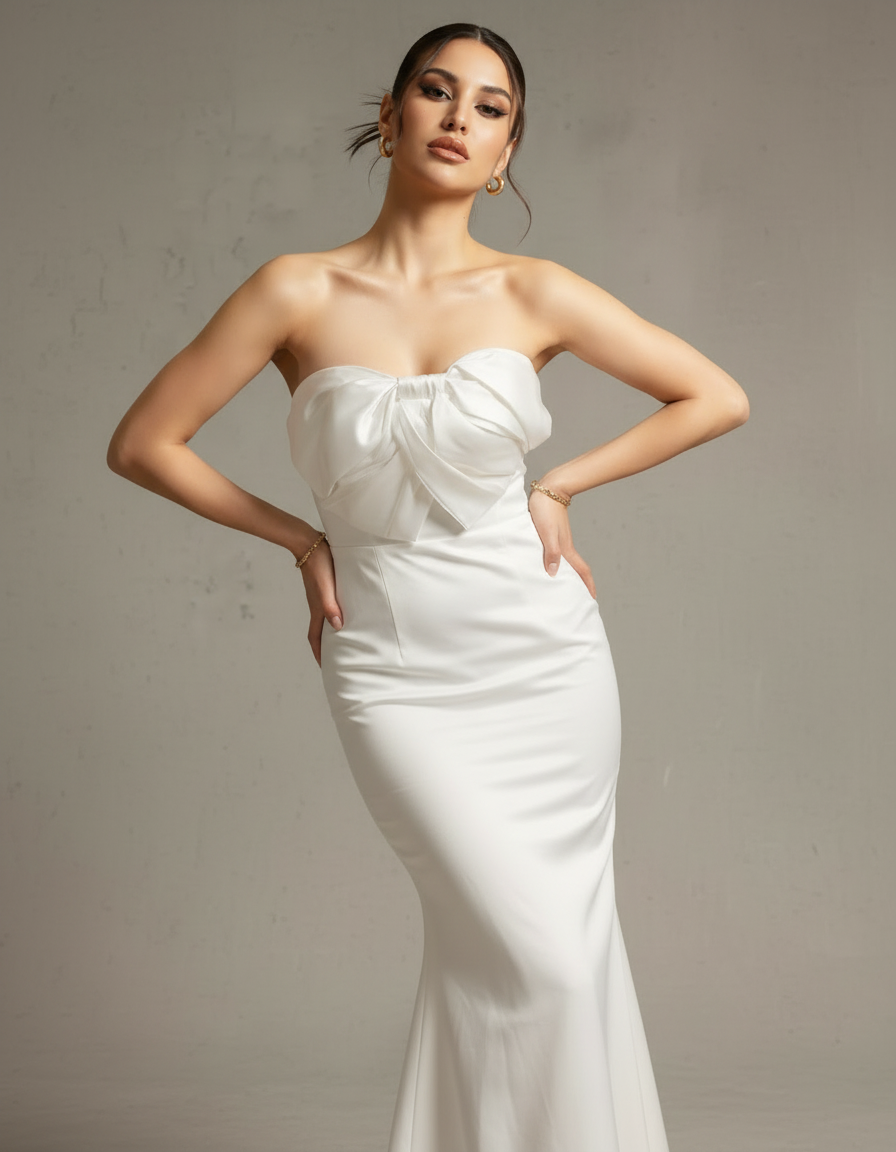 Capture pure elegance in this stunning white strapless mermaid gown. The highlight of this dress is the beautifully crafted, oversized bow on the sweetheart neckline, adding a touch of romantic drama. The fitted bodice and waist flow gracefully into a floor-length mermaid skirt, creating a classic and sophisticated hourglass silhouette. Made from a smooth, high-quality fabric with a subtle sheen, this gown is perfect for weddings, galas, or any formal event where you want to look absolutely unforgettable. It’s a timeless piece that exudes grace and style.