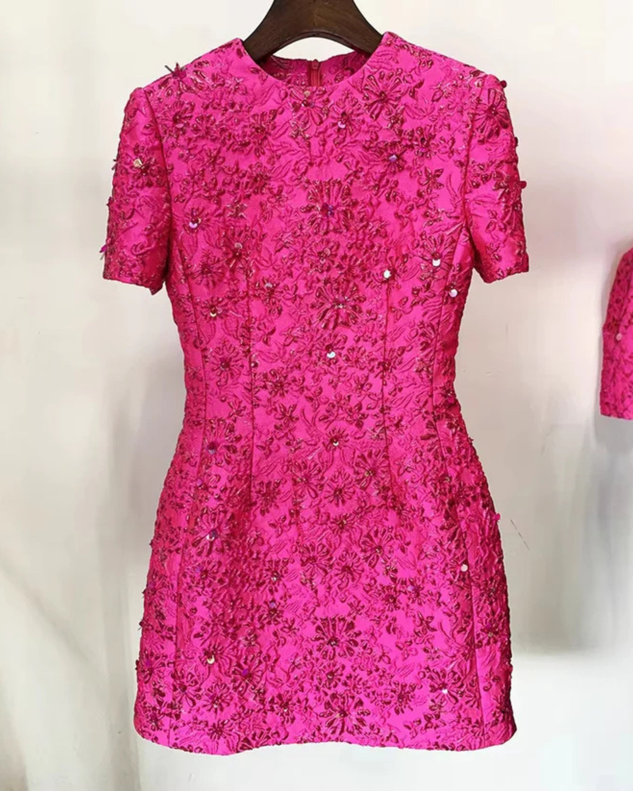 This striking mini dress features a vivid fuchsia pink hue with an intricate floral-textured fabric that adds depth and dimension. Embellished with sparkling crystals scattered across the bodice and skirt, it brings a glamorous touch to its elegant silhouette. The dress has short sleeves, a fitted waist, and a clean round neckline, making it perfect for cocktail events, parties, or any occasion where you want a bold, eye-catching look.