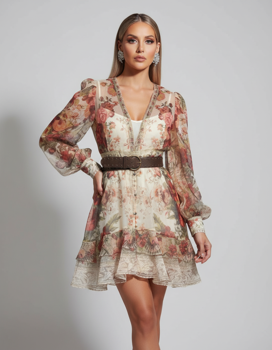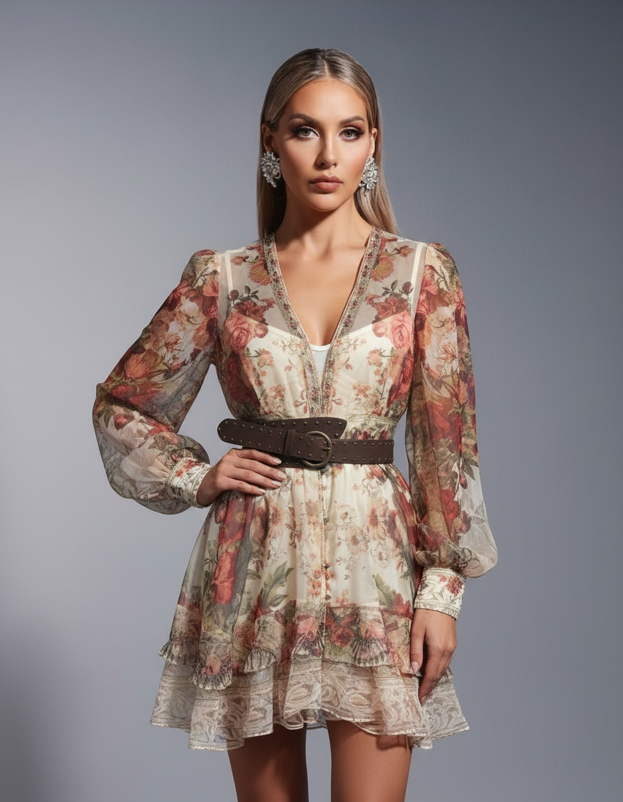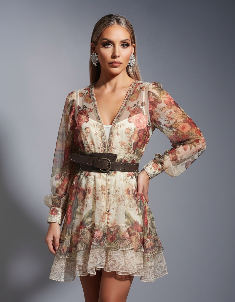 Embrace romance with this beautiful floral chiffon mini dress. The dress features a delicate floral print on a semi-sheer fabric, with long, voluminous sleeves and a V-neckline. The tiered, ruffled skirt adds a playful, feminine touch. An embroidered trim along the neckline and a wide, studded belt create a flattering, bohemian-inspired look. The dress has a button-front closure and is partially lined. Perfect for a brunch, a date, or a special occasion, this dress exudes effortless charm and elegance. Its airy silhouette and romantic details make it a standout piece for any wardrobe.