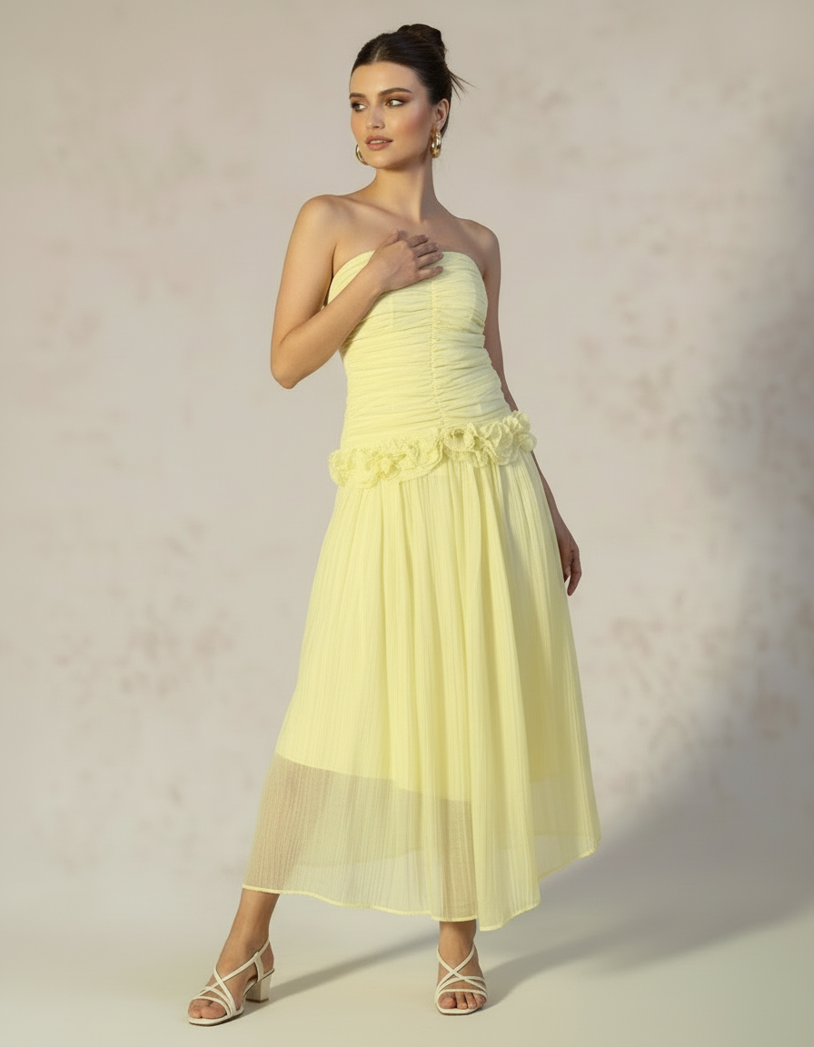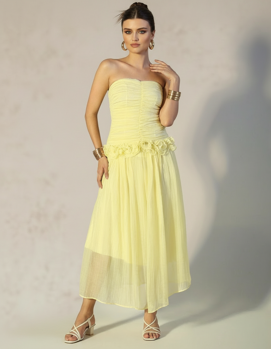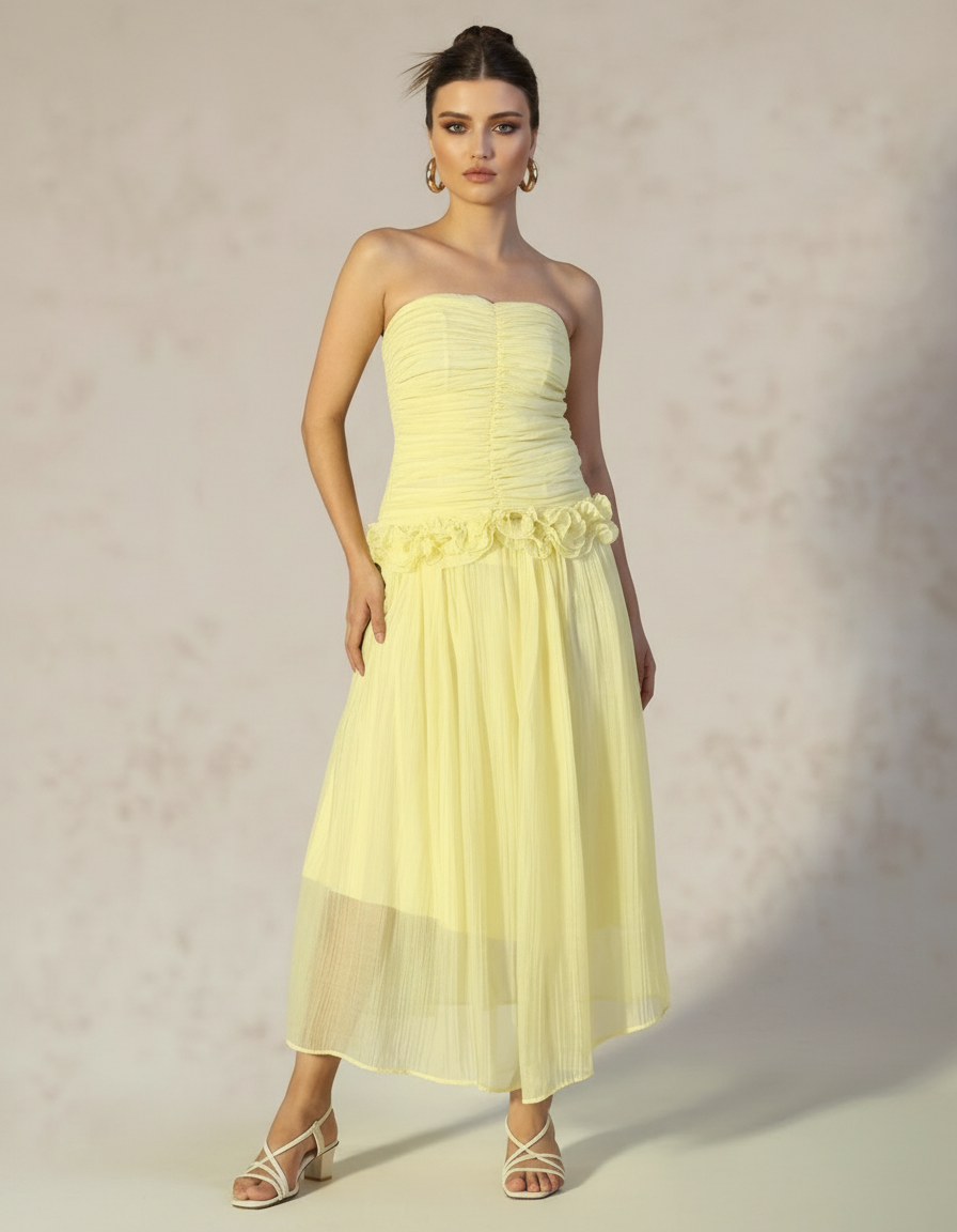 Sunburst Chiffon Ruffle Midi Dress Cascading tiers of buttery yellow chiffon ruffles define this strapless midi, anchored by a ruched corset bodice that provides structured support. Dramatic fluted sleeves and a voluminous skirt deliver movement and visual impact, while layered chiffon catches light for an ethereal quality. The design balances romantic femininity with architectural silhouette—ideal for beach weddings, summer celebrations, and occasions demanding both elegance and presence. Versatile enough for daytime events yet statement-making enough to command attention.