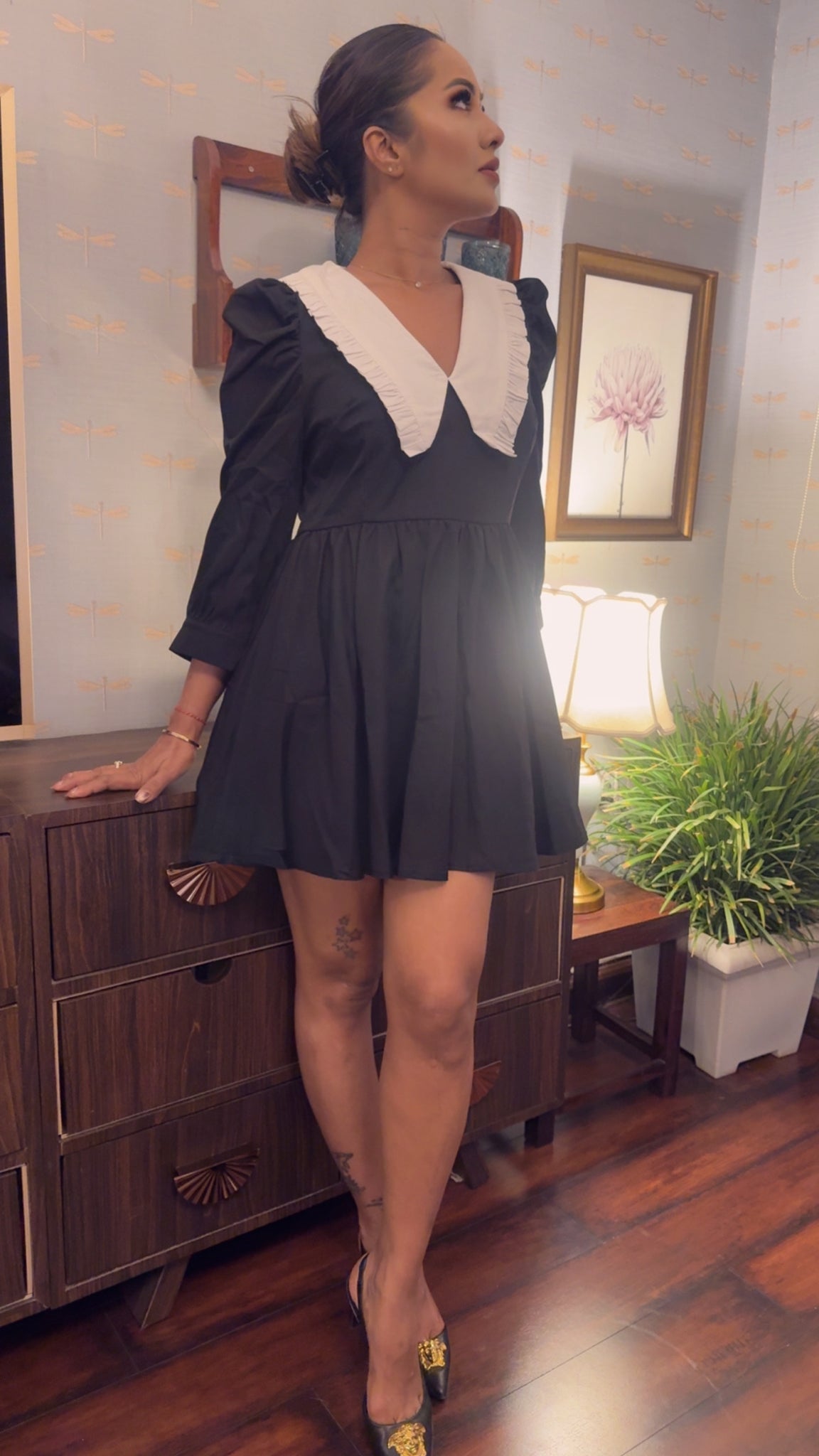 Add a timeless twist to your wardrobe with the Classic Charm Contrast Collar Dress, a chic piece that effortlessly blends vintage elegance with modern sophistication. This black dress features a bold white oversized V-collar that adds definition and style, making it a standout choice for any occasion.