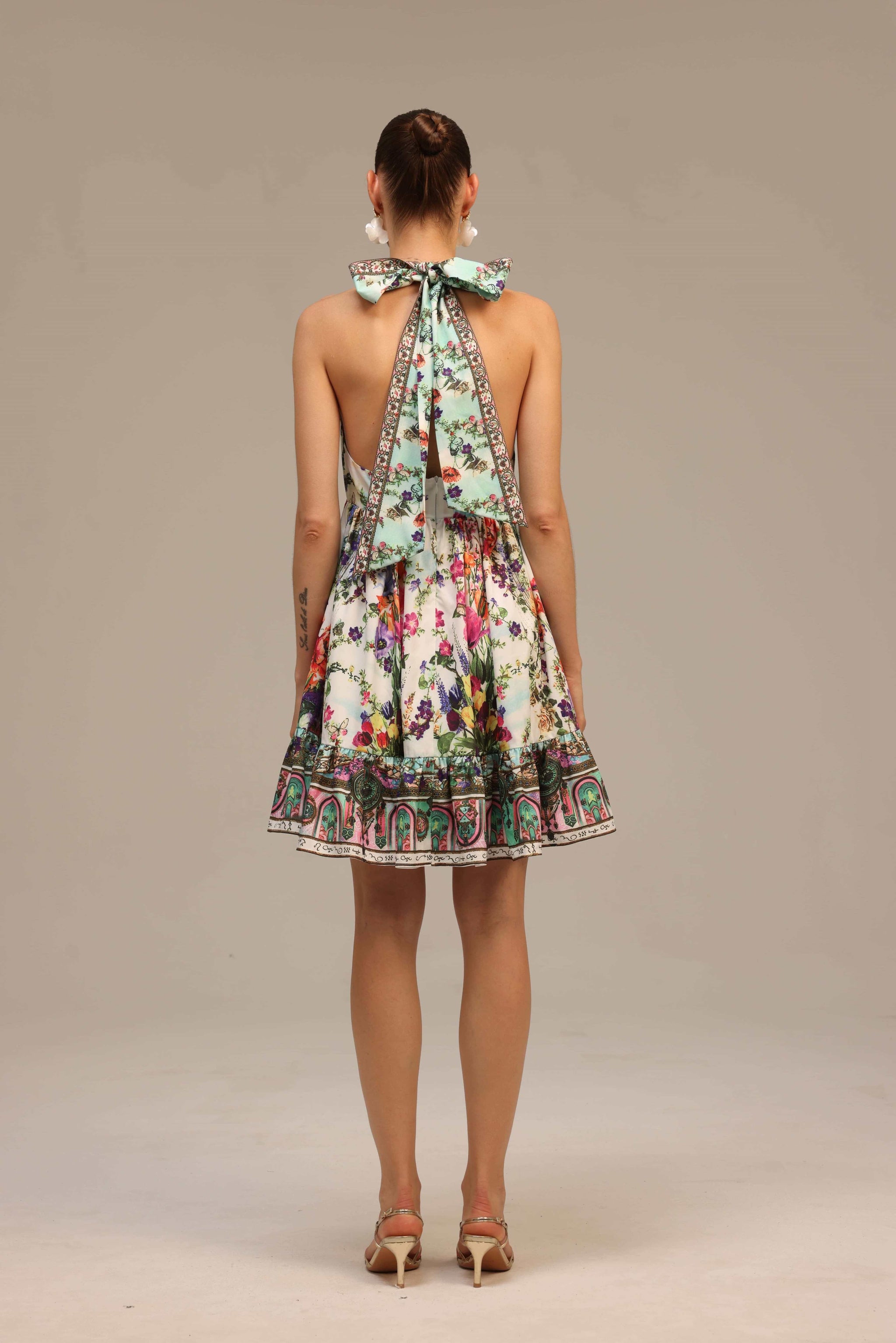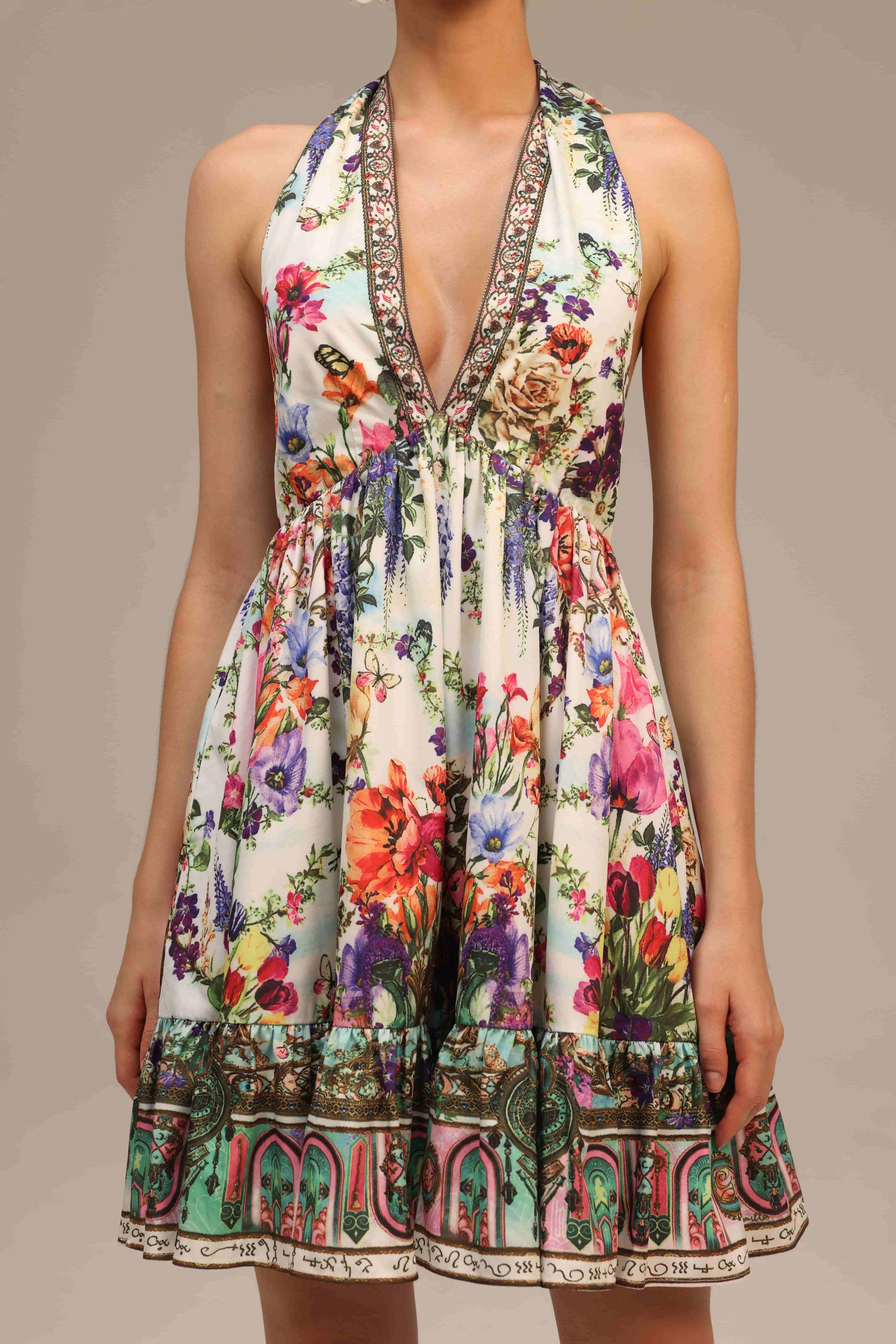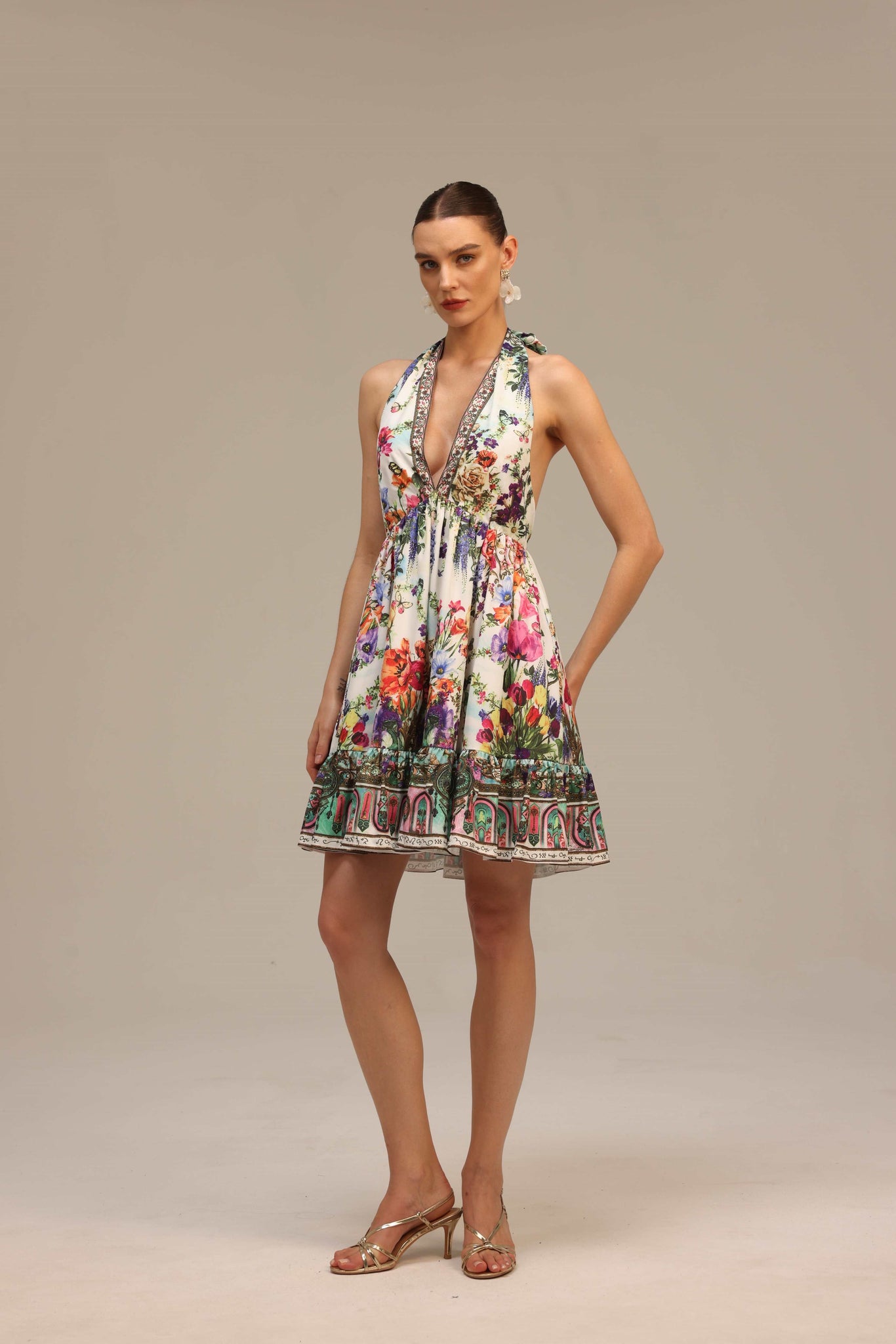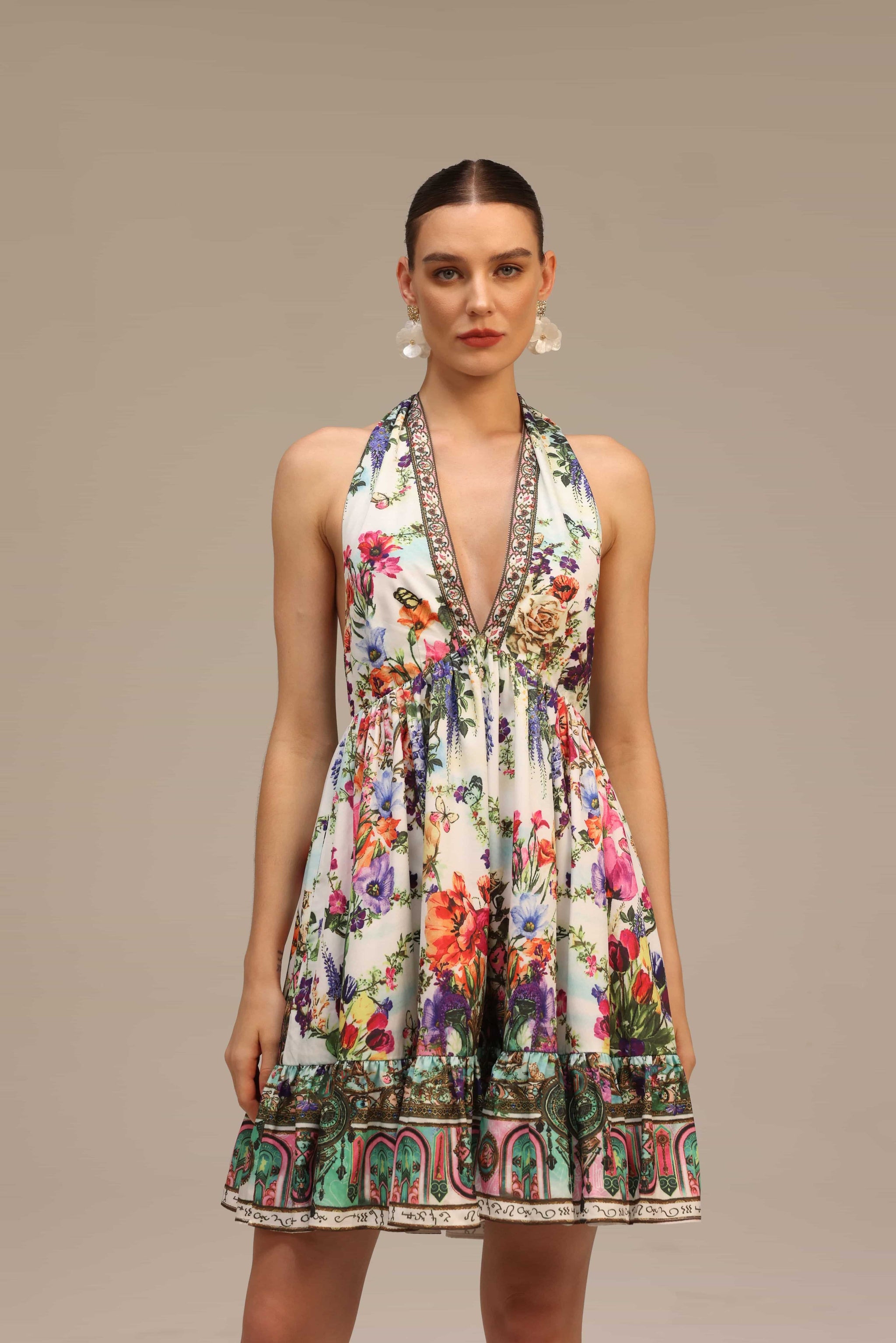 A vibrant halter-neck mini dress bursting with multicolored floral prints, exuding effortless vacation glamour and summer chic.