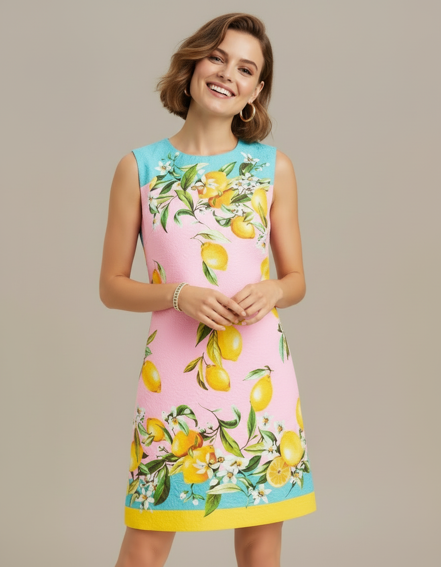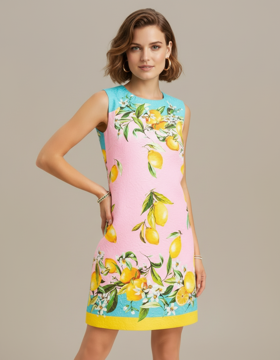 Embrace Mediterranean allure with the Pink Lemon Grove Jacquard Minidress—a vibrant fuchsia design adorned with oversized lemon and leaf motifs that evoke sun-drenched Sicilian landscapes. The sleeveless halter silhouette features a striking turquoise trim and delicate gold necklace detailing, flowing to a flattering mini length. Versatile and statement-making, this piece transitions effortlessly from beach clubs to resort dinners, pairing beautifully with strappy sandals for warm-weather occasions that demand editorial polish.