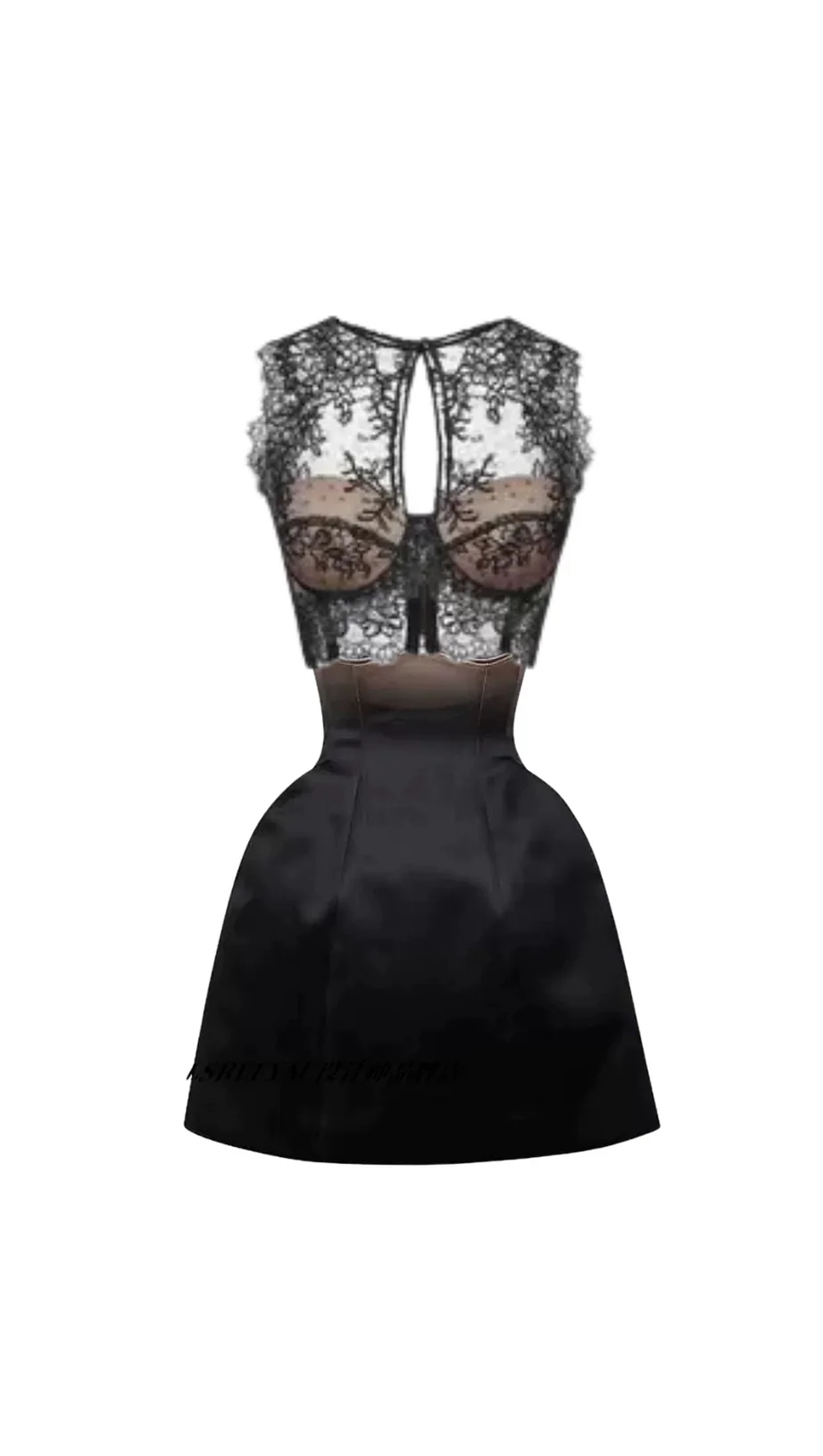 - Design: A flattering A-line silhouette with a chic mini length. The top boasts intricate sheer lace with a subtle keyhole detail at the neck.