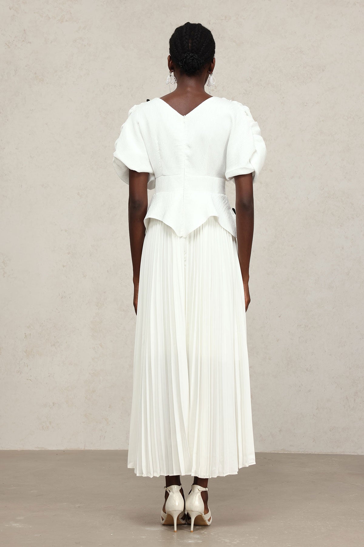 Make a bold statement with this white floral-embellished gown, featuring dramatic draped detailing at the bodice and vibrant floral accents. The flowing pleated skirt with printed floral motifs adds elegance and movement, making this a true show-stopping piece for grand occasions.