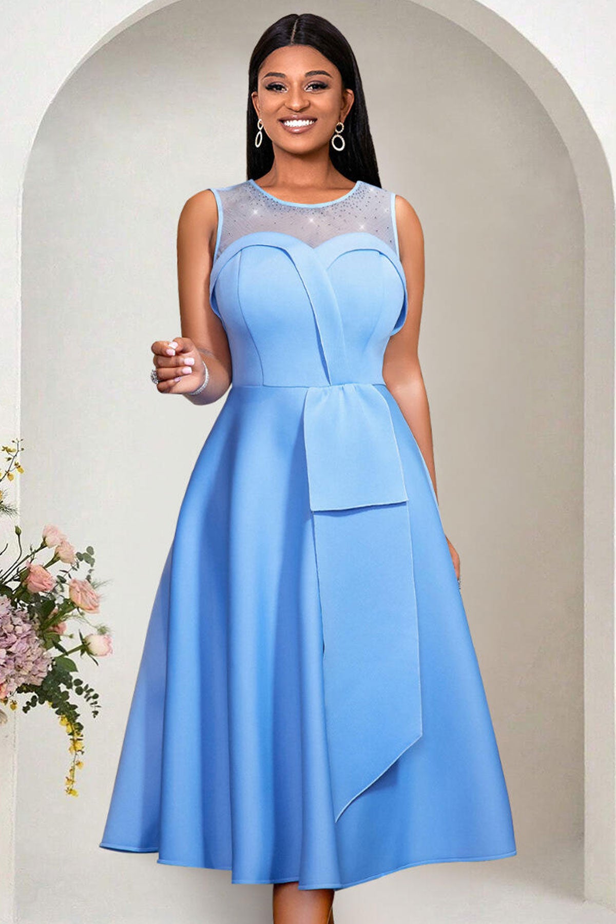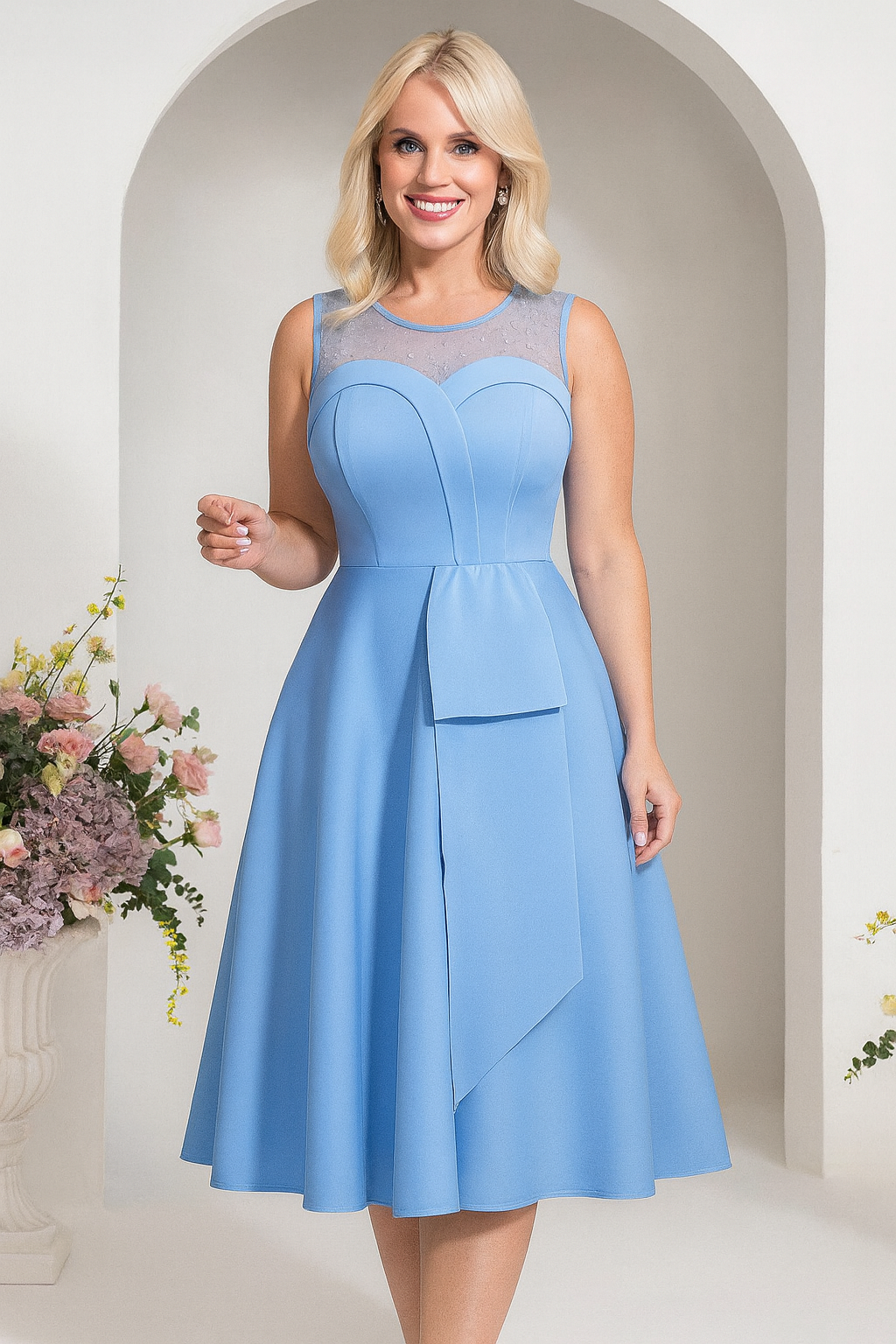 Graceful and timeless, the Serenity Sleeveless A-Line Dress in sky blue features a sheer neckline overlay and soft pleated detailing for a refined, feminine look. Perfect for weddings, brunches, or formal occasions, this dress combines elegance and comfort in one beautifully tailored silhouette.