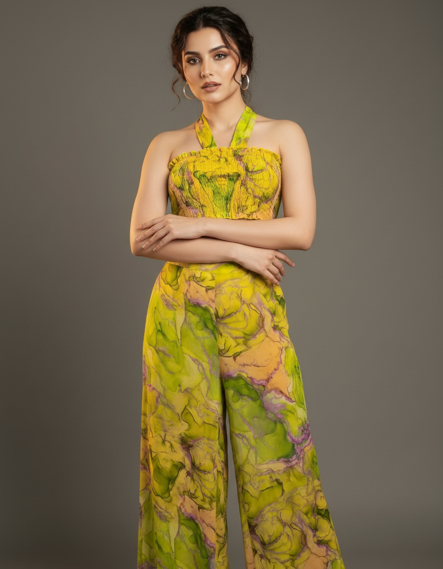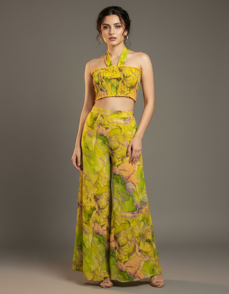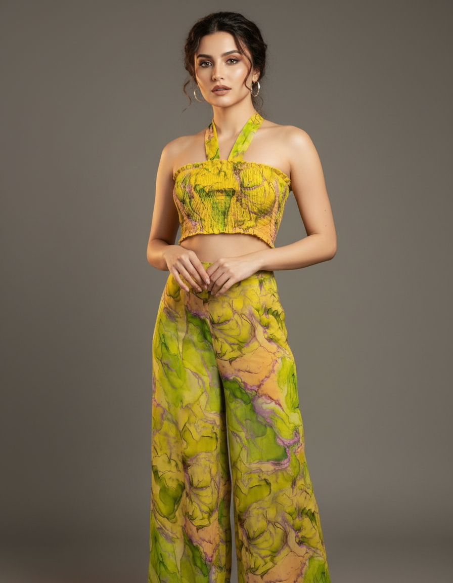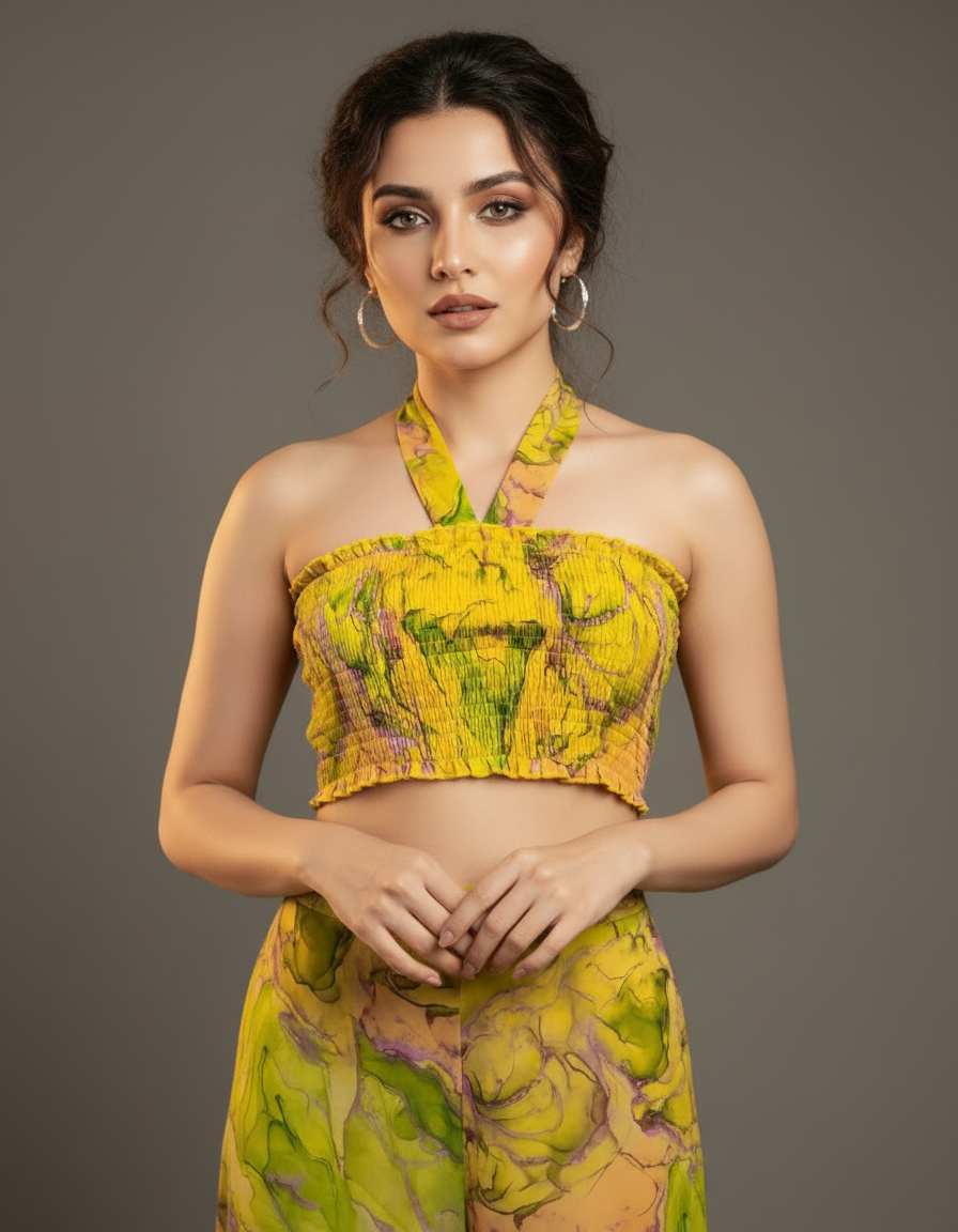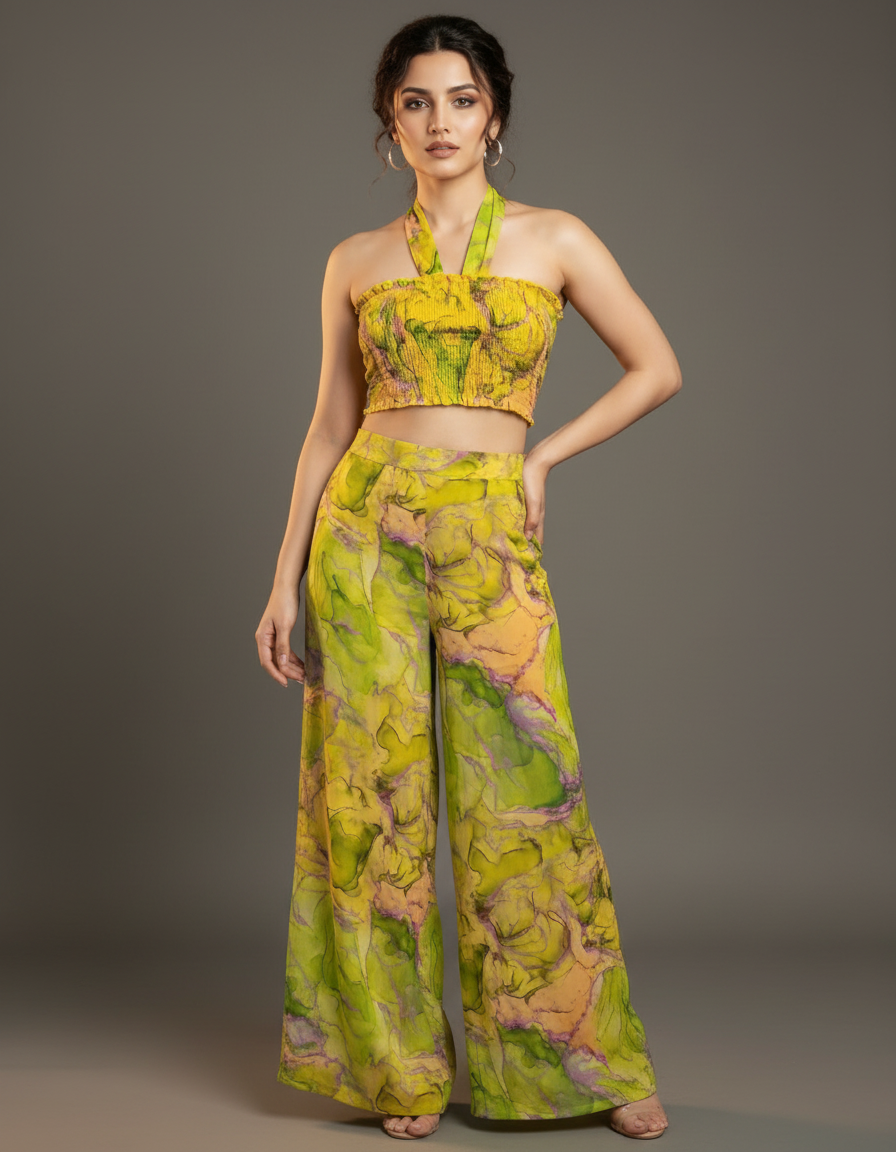 Stand out from the crowd in this vibrant and artistic co-ord set. The set includes a smocked bandeau top with a self-tie detail and a pair of matching high-waisted, wide-leg trousers. The eye-catching abstract print features swirls of yellow, green, and pink, creating a unique and modern look. The lightweight and flowy fabric ensures both comfort and style, making it perfect for warm weather. Ideal for vacations, festivals, or a stylish day out, this co-ord set is a true fashion statement that can be worn together or as separates.
