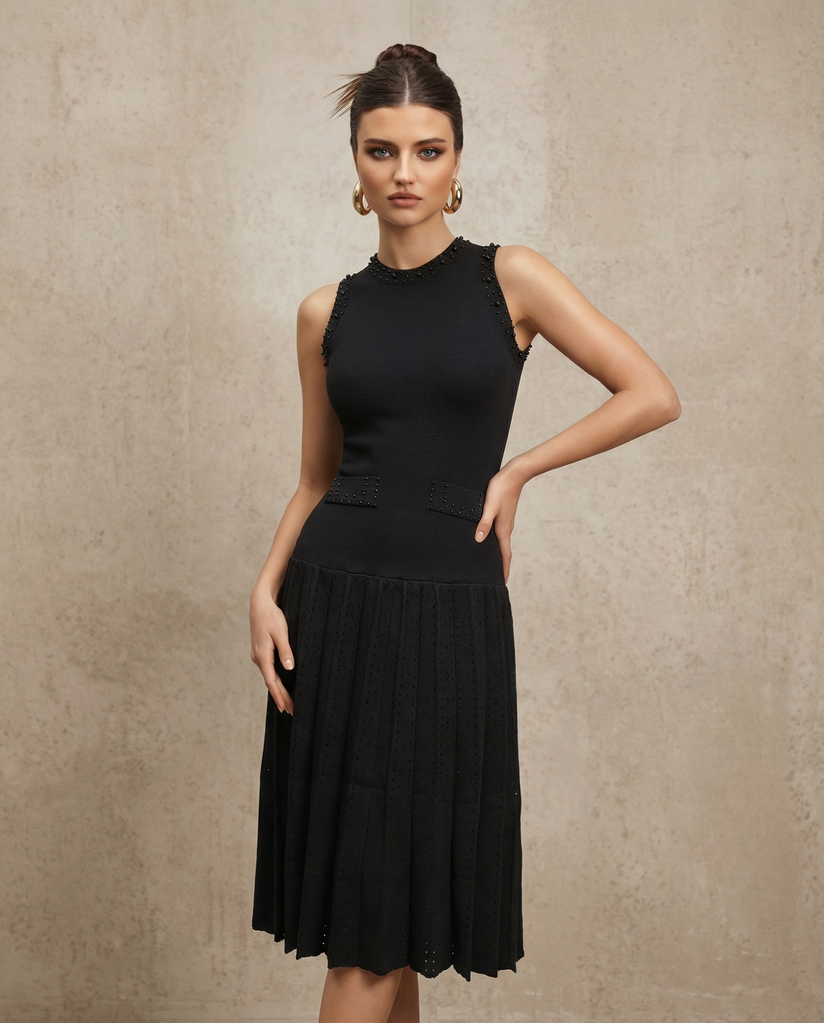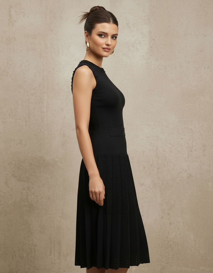 This sophisticated black midi dress epitomizes refined elegance with its meticulously crafted beaded detailing. The fitted bodice features intricate beadwork at the crew neckline, shoulders, and cinched waist, creating dimensional texture without overwhelming the silhouette. A graceful pleated skirt flows from the waist to knee-length, while coordinating beaded accents at the hemline complete the polished aesthetic. Sleeveless and versatile, this piece transitions seamlessly from cocktail receptions to formal dinners, offering understated glamour for those who appreciate timeless sophistication.