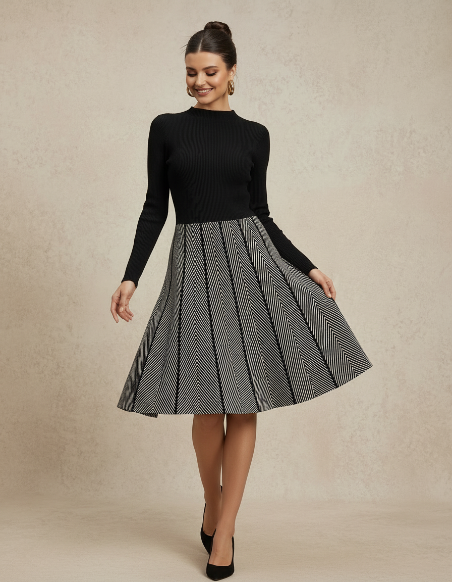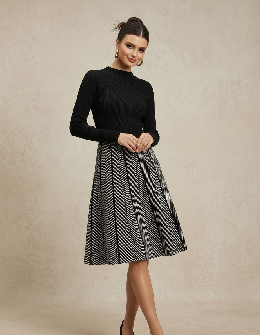 Elevate your wardrobe with this striking two-piece-style dress that merges refined tailoring with contemporary pattern play. The fitted black ribbed knit mockneck top features vertical ribbing and extended sleeves for a streamlined silhouette, while the bold black-and-white chevron midi skirt commands attention with its herringbone geometry. The fit-and-flare silhouette cinches at the natural waist before releasing into a graceful A-line with subtle pleating, delivering both structure and movement. Versatile enough for boardroom presentations, intimate dinners, or elevated casual moments, this dress bridges the gap between timeless knitwear sophistication and modern graphic sensibility.