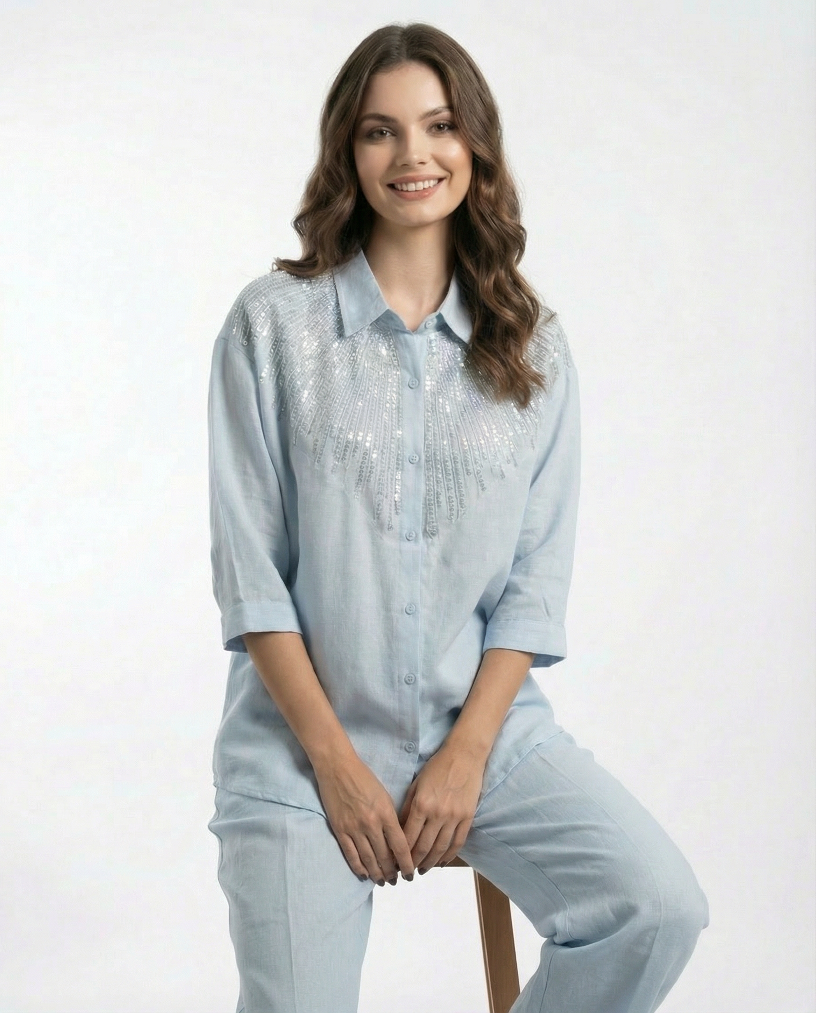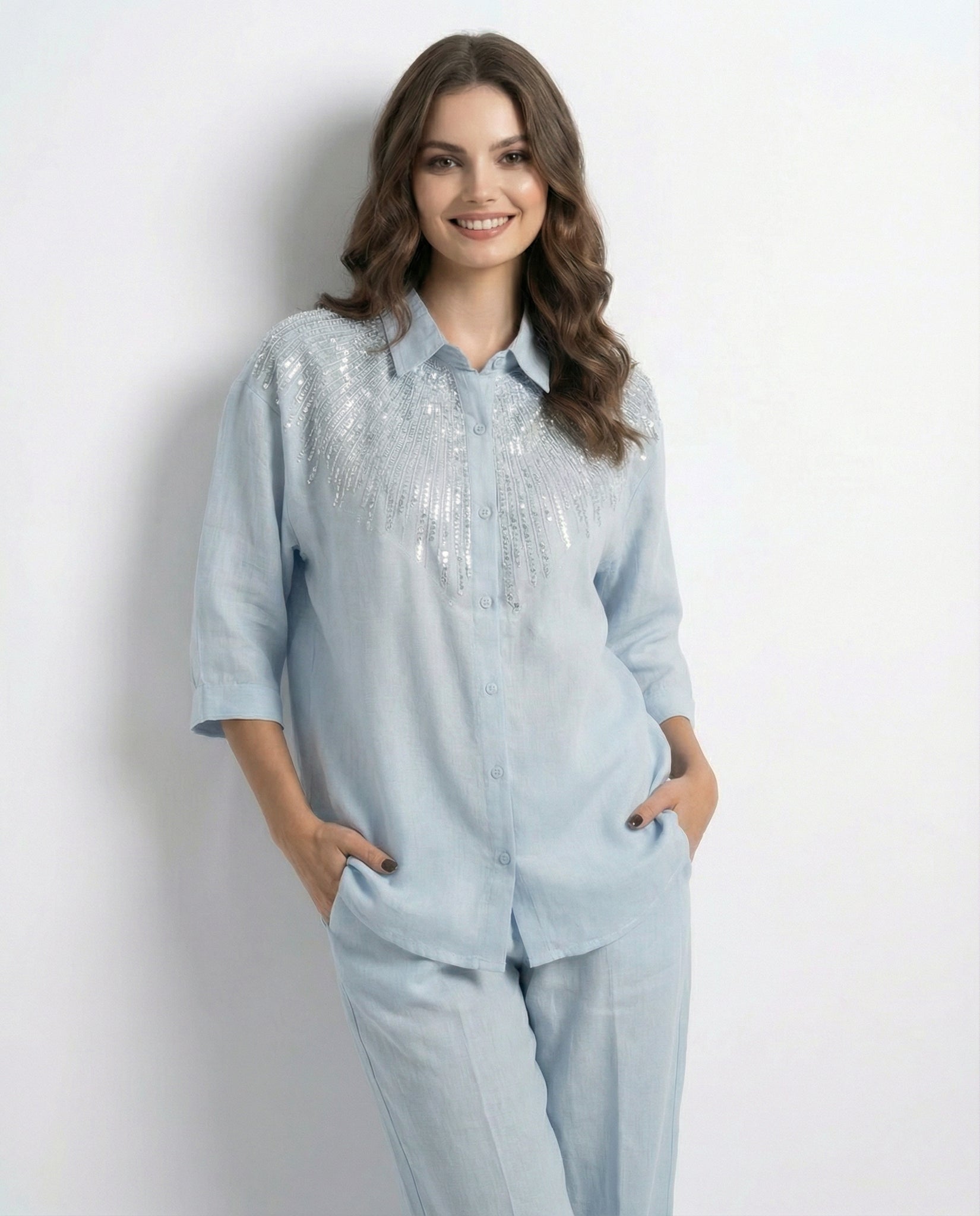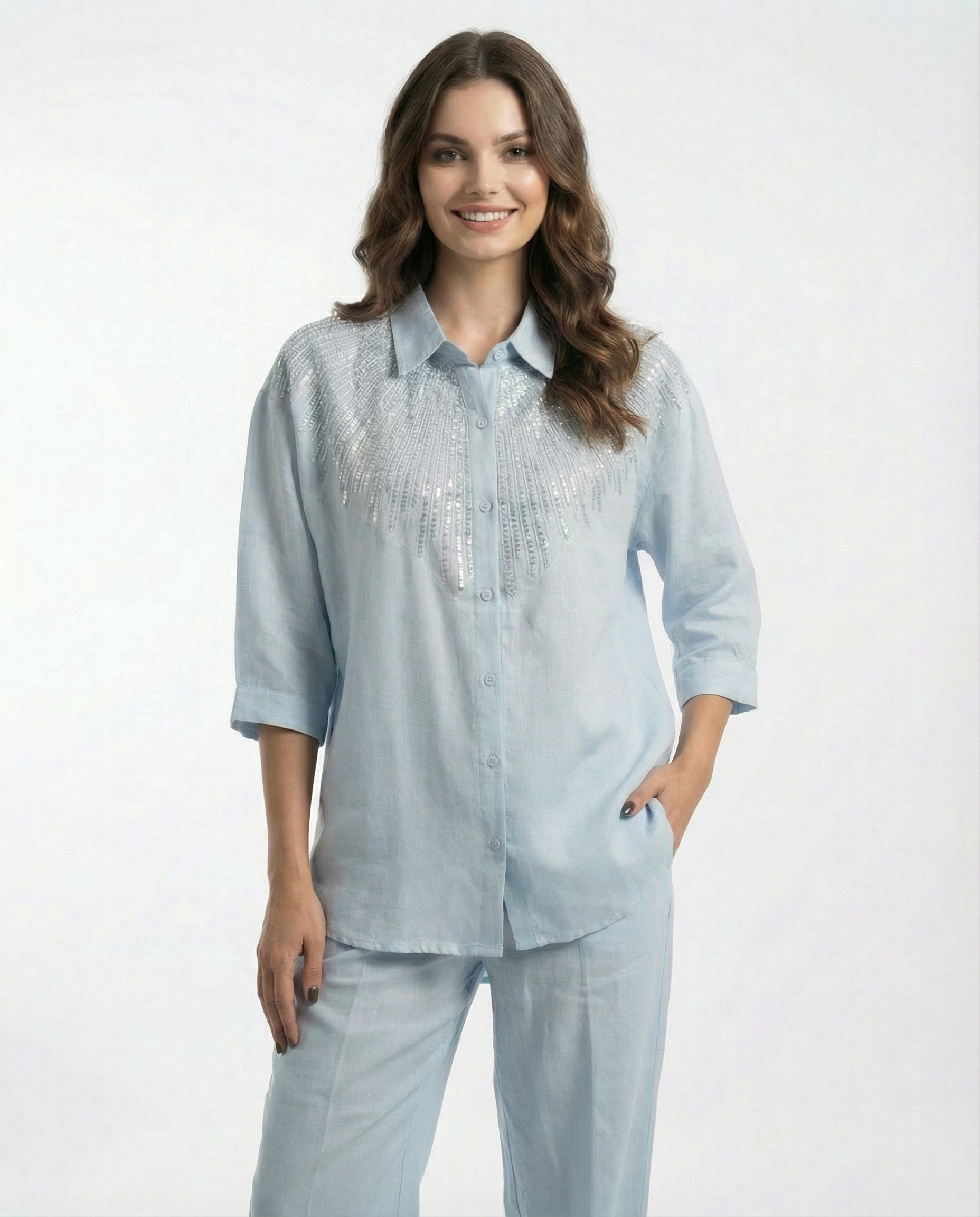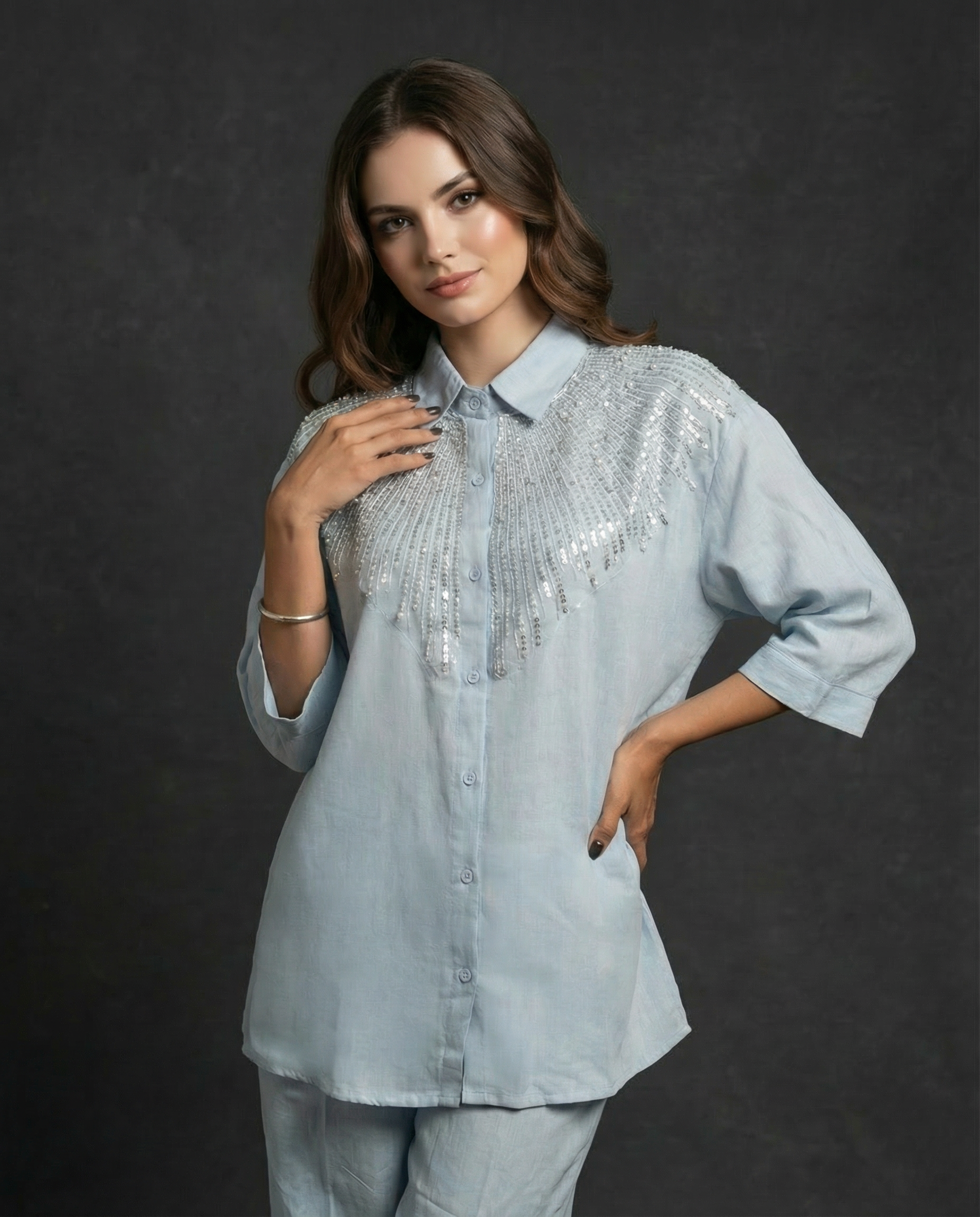 Powder Blue Linen Co-ord Set Effortless luxury meets resort elegance in this ice-blue linen two-piece. The lightweight shirt features a classic collar, button-front closure, and three-quarter sleeves adorned with cascading silver sequin fringe from the shoulders—a refined detail that elevates any occasion. Paired with matching straight-leg pants in a relaxed fit, the breathable linen construction ensures comfort in warm climates. Perfect for beach clubs, tropical escapes, or elevated summer gatherings. Style with minimal accessories and sandals for understated sophistication.