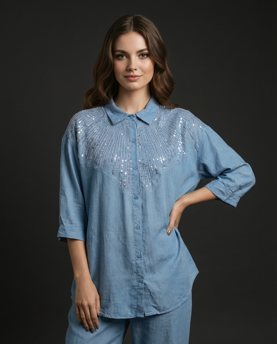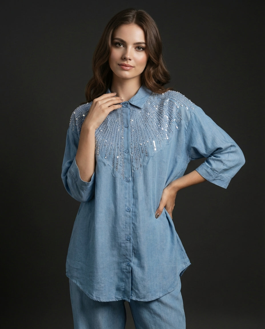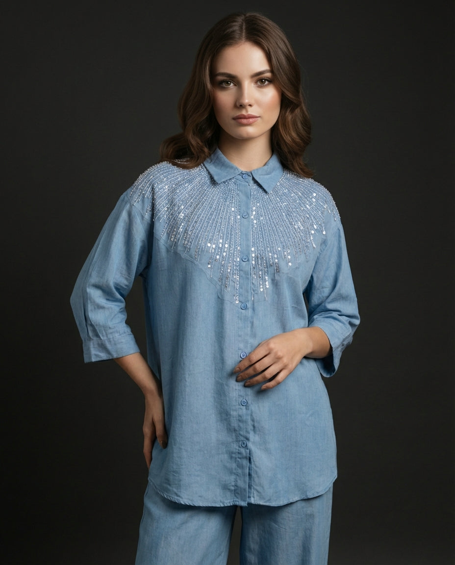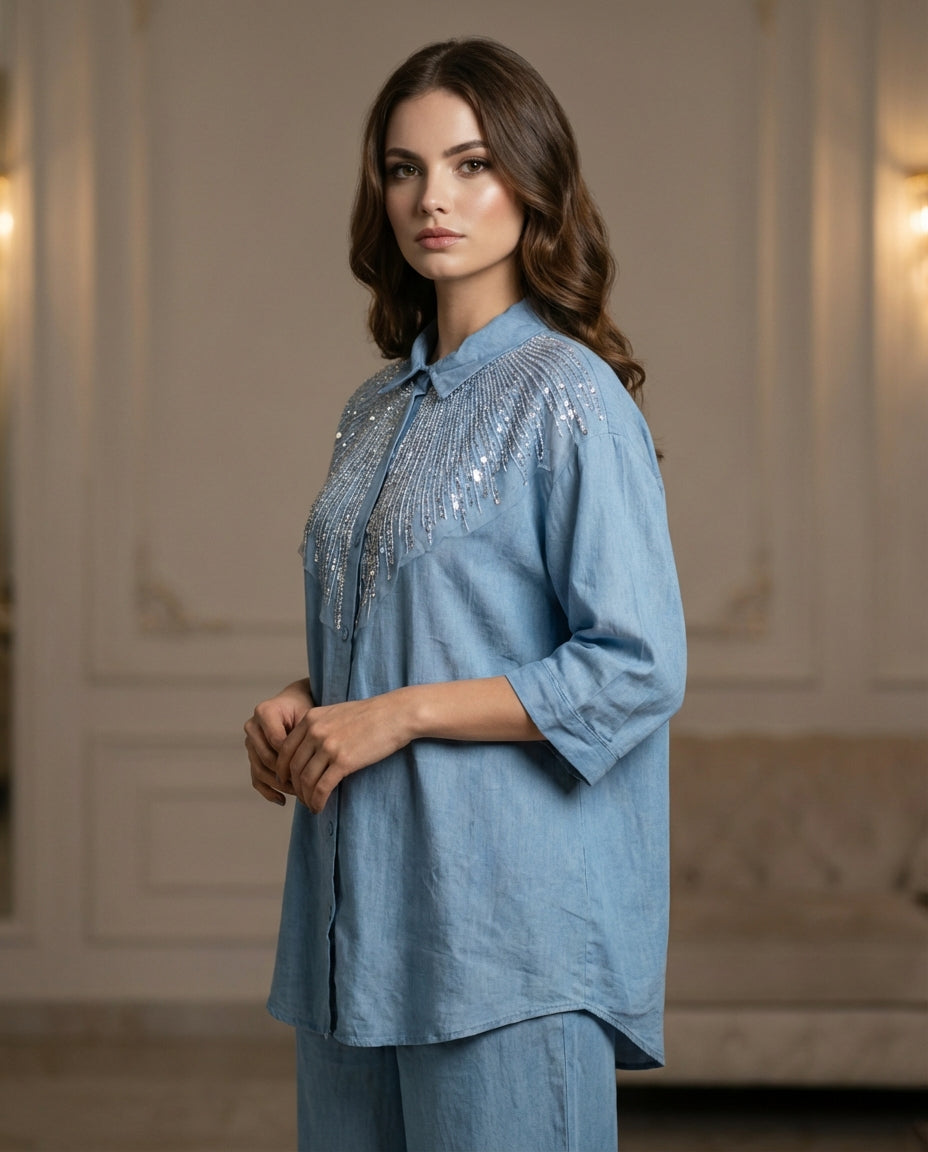 Powder Blue Linen Co-ord Set Effortless luxury meets resort elegance in this ice-blue linen two-piece. The lightweight shirt features a classic collar, button-front closure, and three-quarter sleeves adorned with cascading silver sequin fringe from the shoulders—a refined detail that elevates any occasion. Paired with matching straight-leg pants in a relaxed fit, the breathable linen construction ensures comfort in warm climates. Perfect for beach clubs, tropical escapes, or elevated summer gatherings. Style with minimal accessories and sandals for understated sophistication.