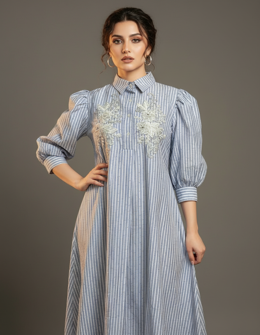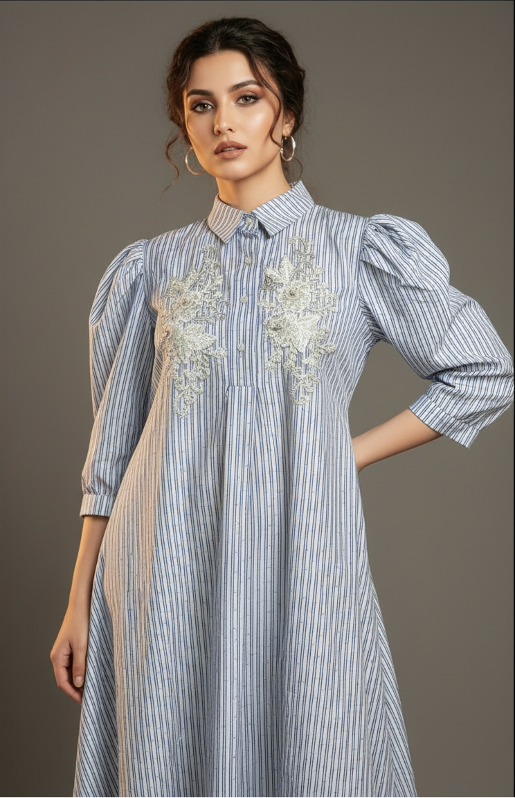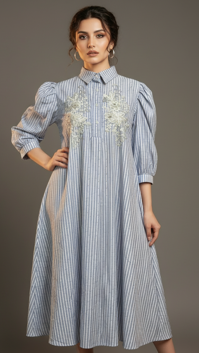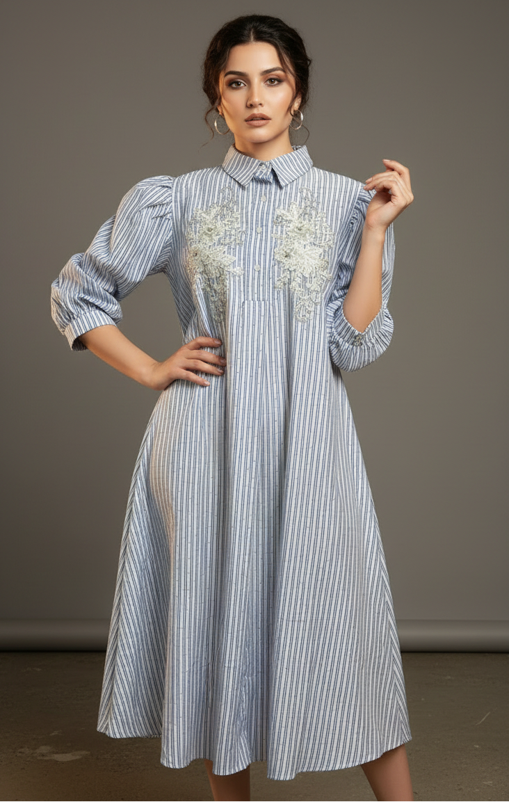 Chic, breezy, and effortlessly elegant — the Blue Grace Embroidered Shirt Dress is a perfect fusion of comfort and sophistication. Crafted from lightweight cotton-blend fabric, this dress features vertical blue and white stripes, delicate floral embroidery on the front, and a button-down shirt silhouette. The puff sleeves add a modern, feminine charm, making it ideal for both casual and semi-formal occasions.