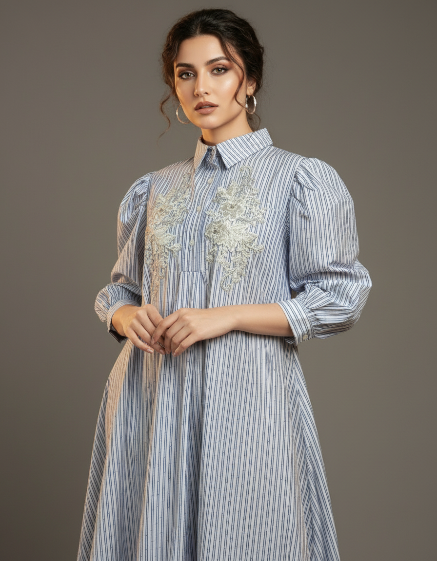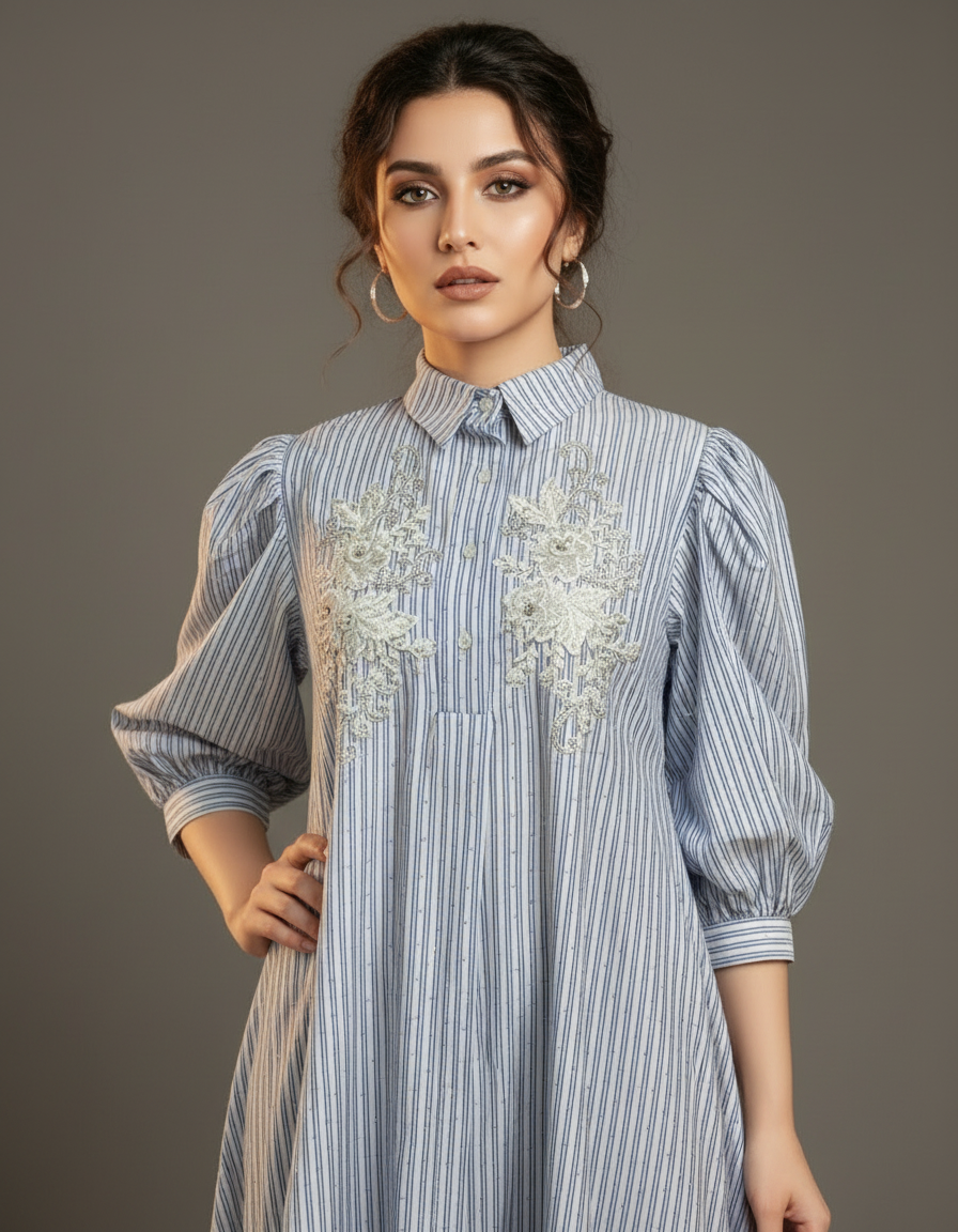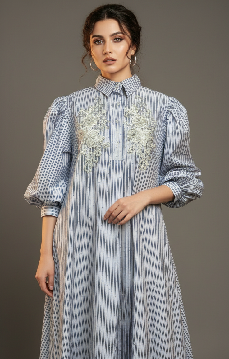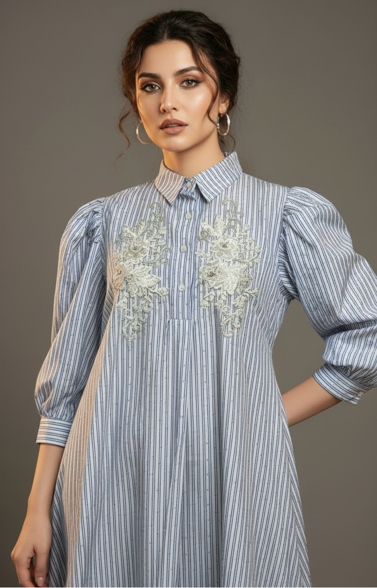 Chic, breezy, and effortlessly elegant — the Blue Grace Embroidered Shirt Dress is a perfect fusion of comfort and sophistication. Crafted from lightweight cotton-blend fabric, this dress features vertical blue and white stripes, delicate floral embroidery on the front, and a button-down shirt silhouette. The puff sleeves add a modern, feminine charm, making it ideal for both casual and semi-formal occasions.