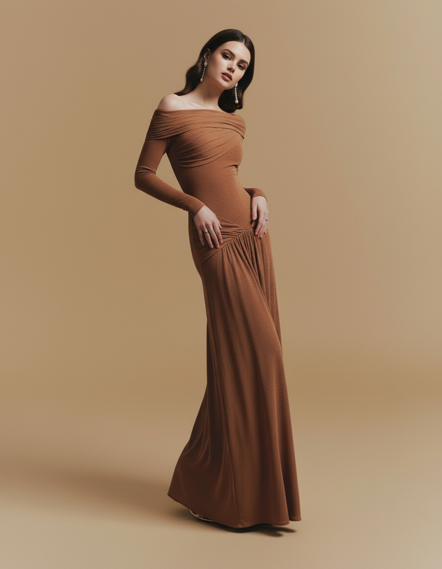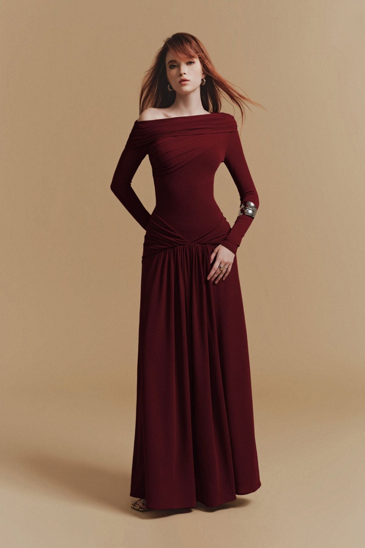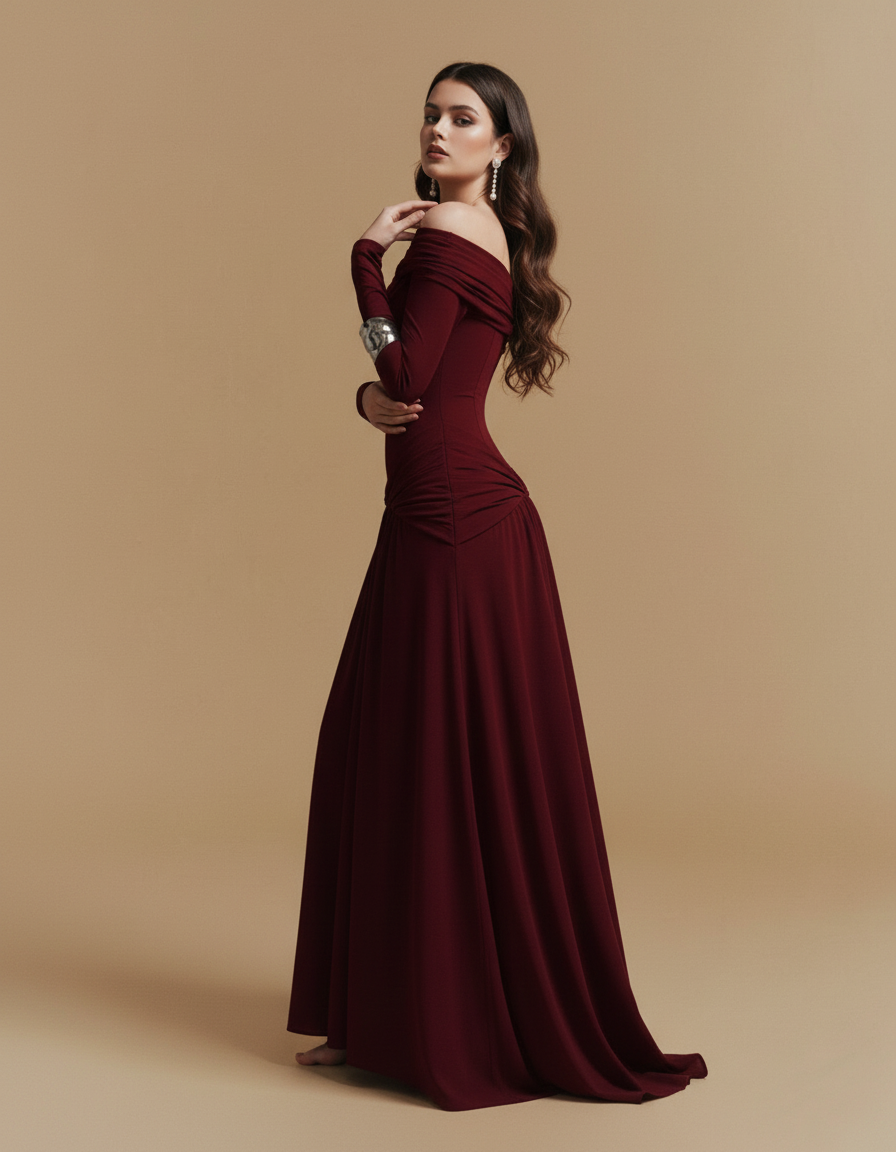 Timeless sophistication meets editorial elegance in this Burgundy Off-Shoulder Draped Maxi Dress. Rendered in luxurious deep wine jersey, the design features horizontal pleating across the bodice and asymmetric waist gathering that creates dimensional movement. The portrait neckline sits gracefully off-shoulder, complemented by long sleeves and a drop-waist silhouette that flows into a gathered A-line skirt sweeping to the floor. A refined choice for autumn weddings, opera evenings, and formal banquets—style with metallic cuffs and strappy heels for maximum impact.