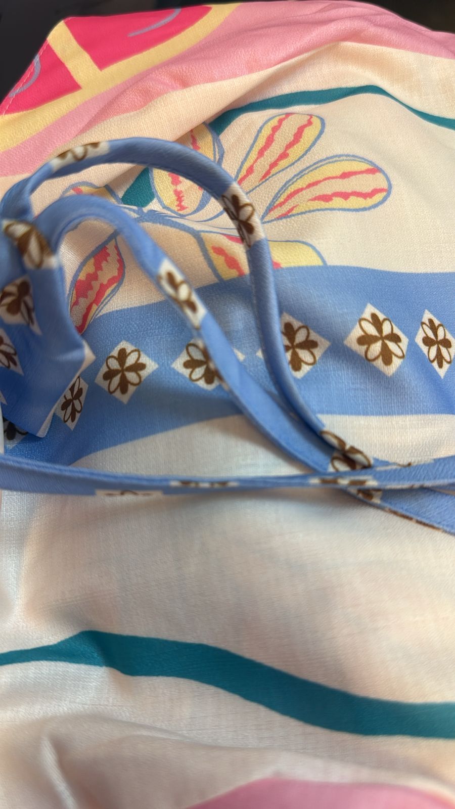 Turn heads in this pastel one-shoulder maxi dress, crafted in a soft blend of blush pink, ivory, and sky blue with playful floral and geometric prints. The asymmetric halter neckline and flared silhouette create an effortlessly chic look, perfect for brunches, vacations, or summer soirées.