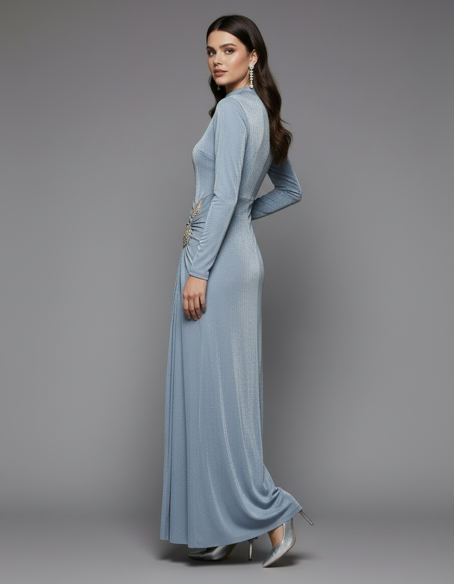 Embody celestial elegance in the Powder Blue Drape Gown, a floor-length mermaid silhouette crafted from shimmering sequin knit. The asymmetrical drape flows from a high mock neck, anchored by a pearl-encrusted knot at the waist. Long sleeves and a subtle train deliver red-carpet sophistication. Designed for galas, awards ceremonies, and black-tie events, this piece channels understated luxury with every movement.